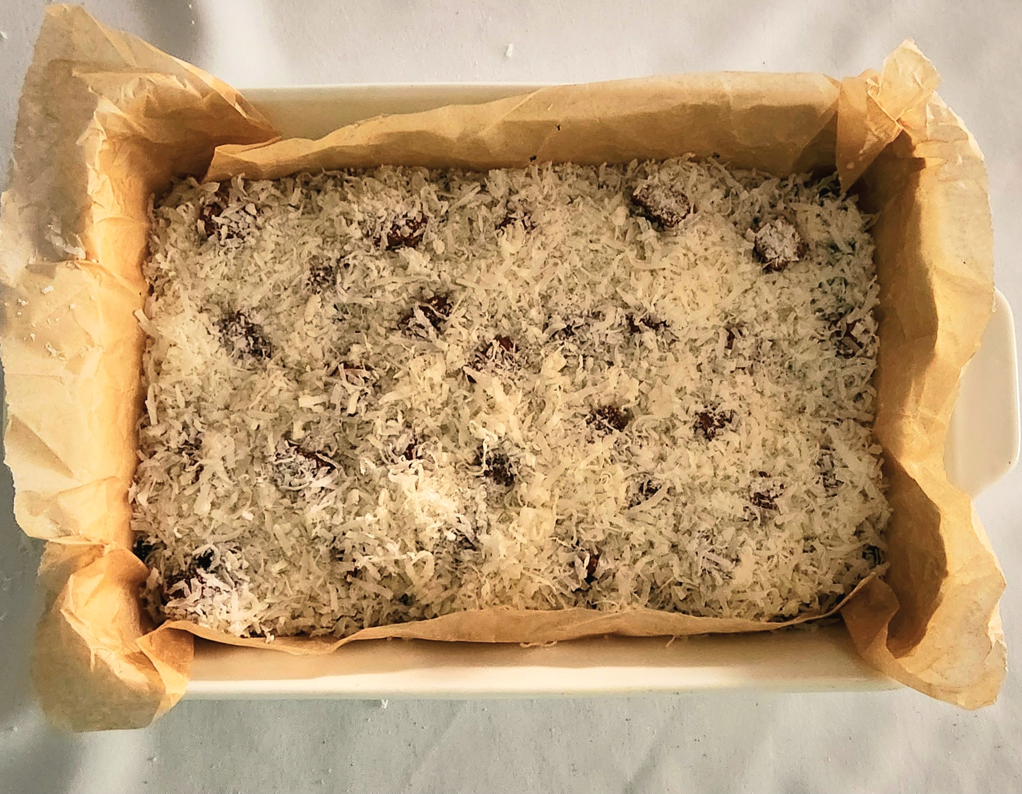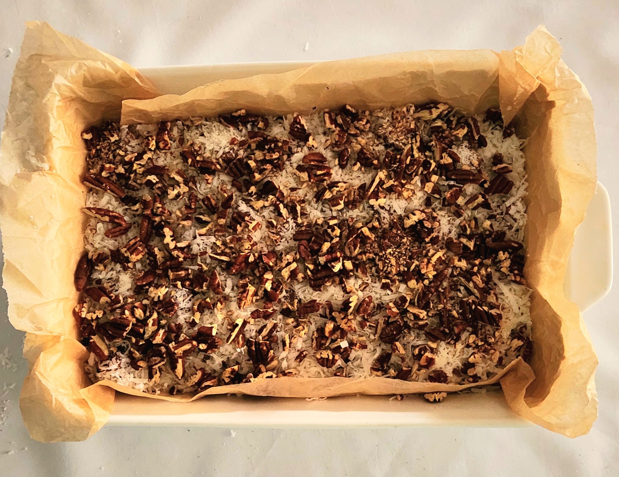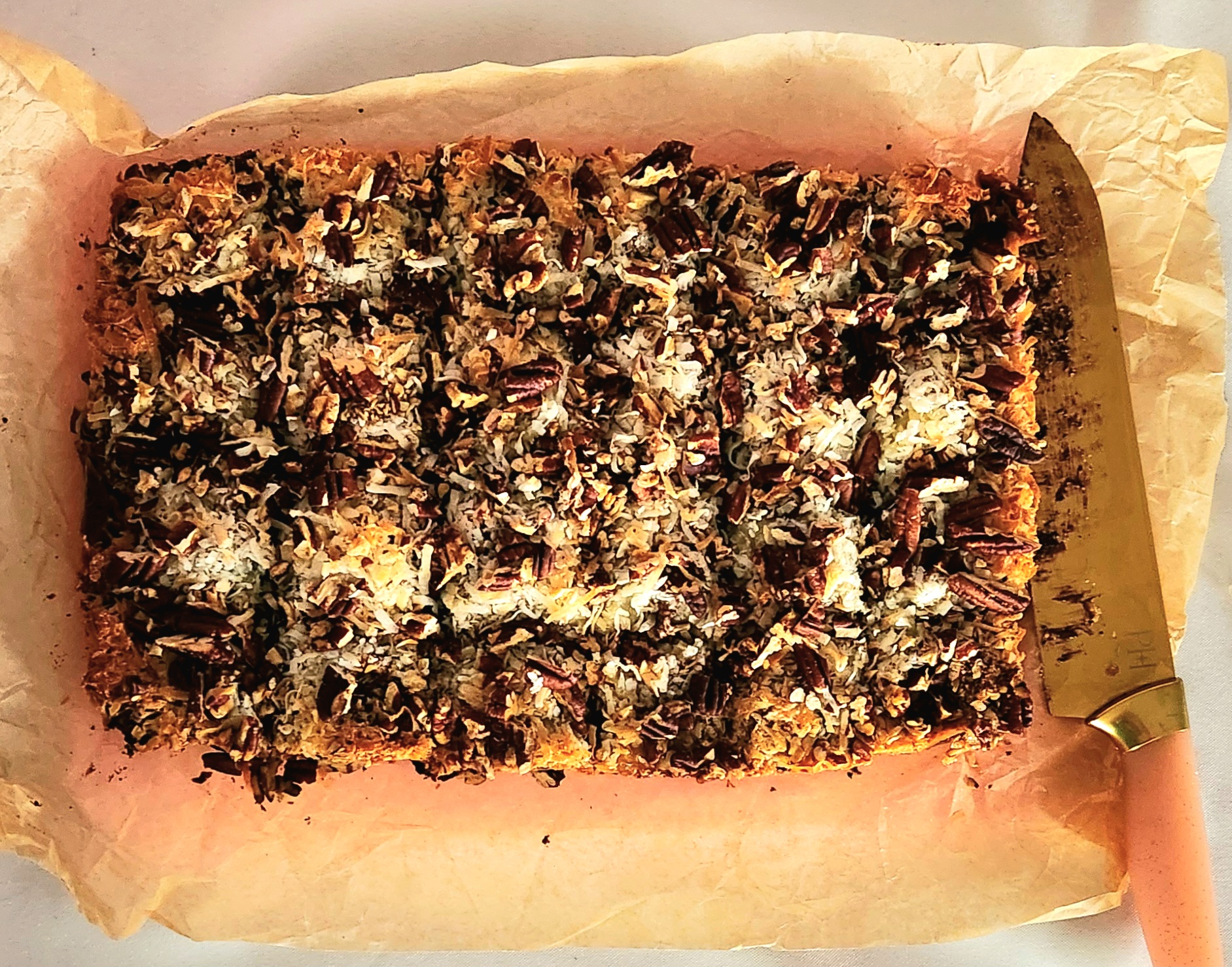 - Place the pan in the oven for 30-35 minutes, flipping halfway through, until the caramel is bubbly and the coconut is golden brown. Allow the slab to cool completely in the pan, then lift it by the parchment paper and transfer it to a cutting board. Using a chef’s knife, cut the slab into a 4×6 grid, leaving you with 24 bars. Store any leftover bars in an airtight container for up to 3 days on the counter, and enjoy!