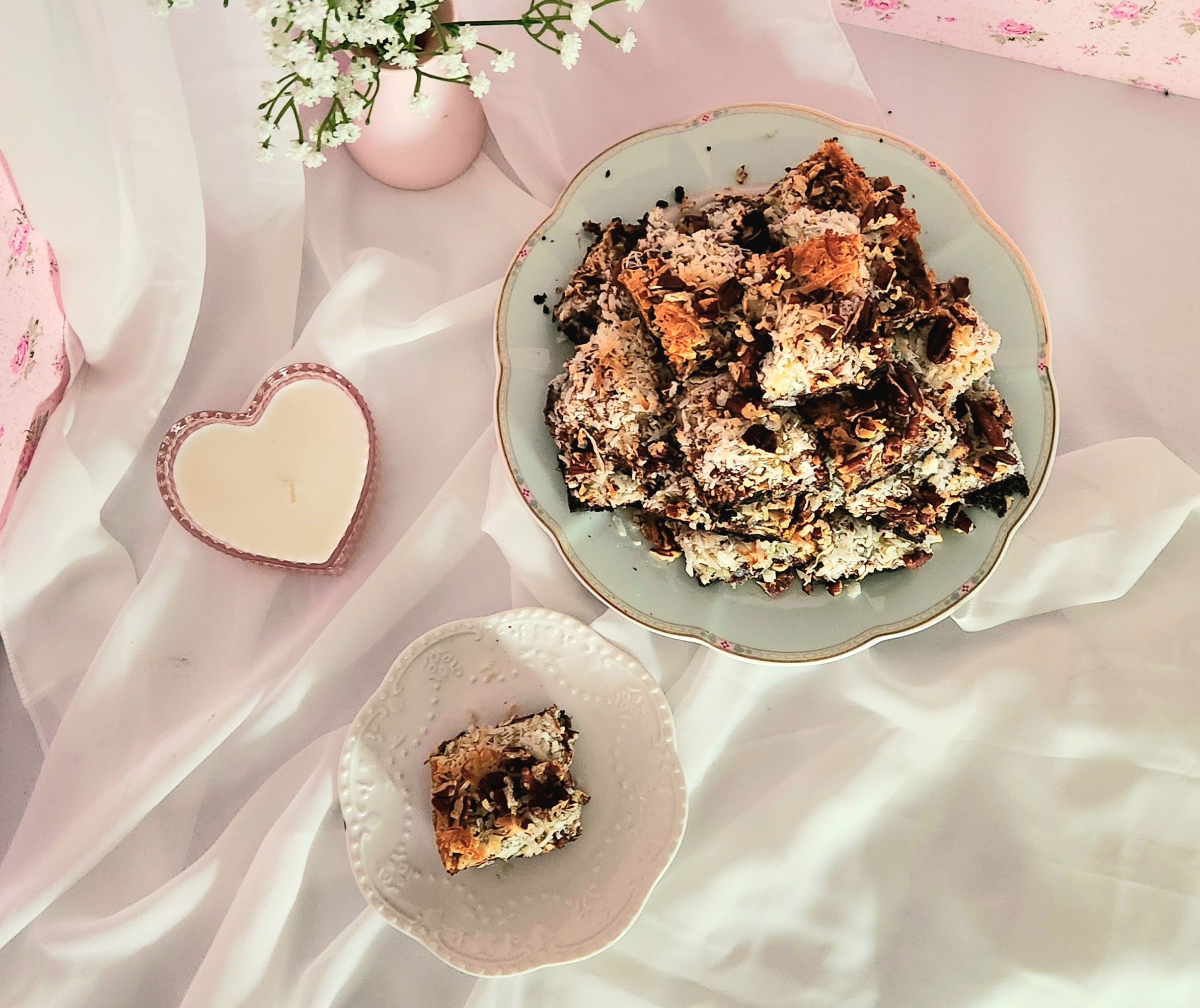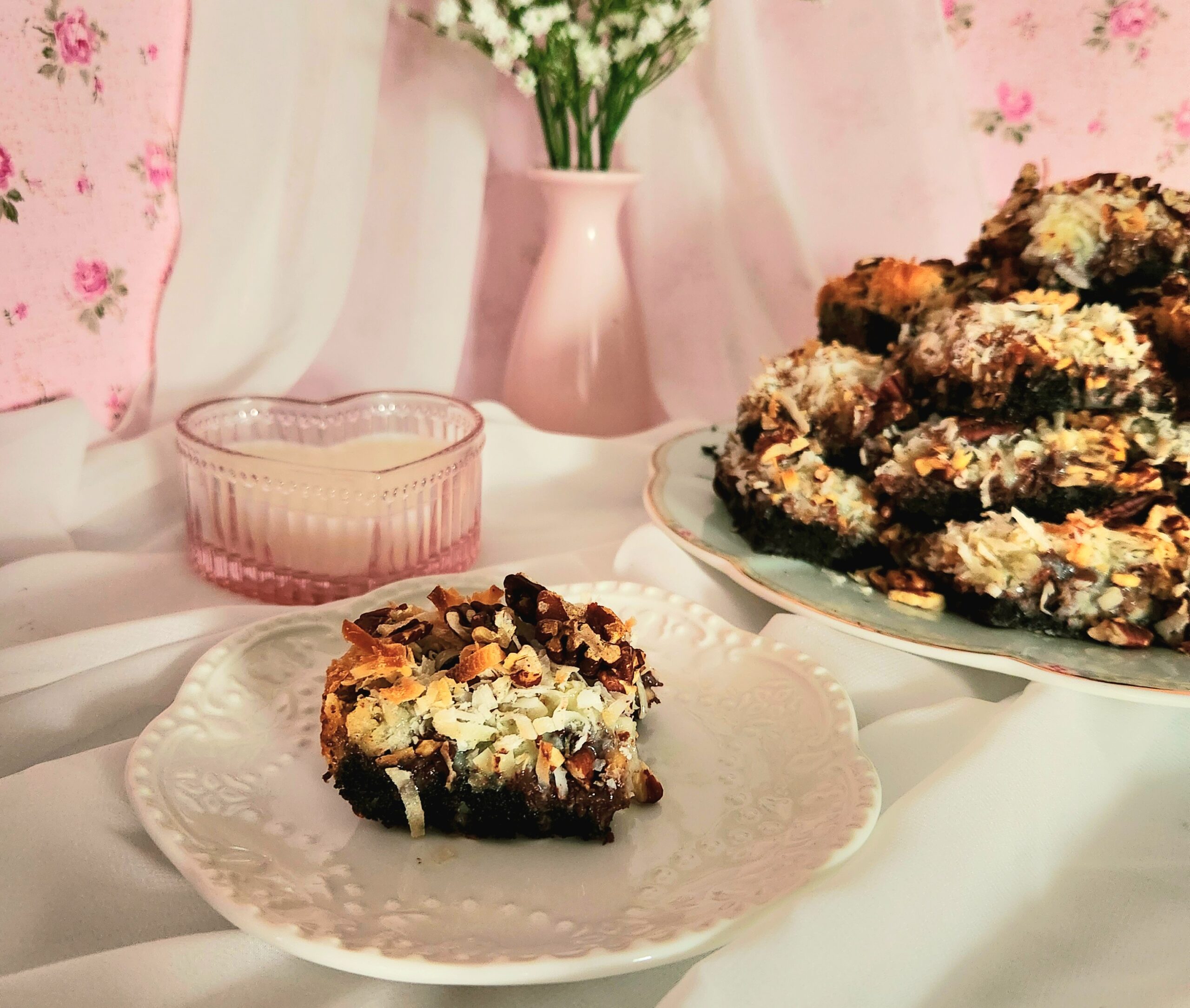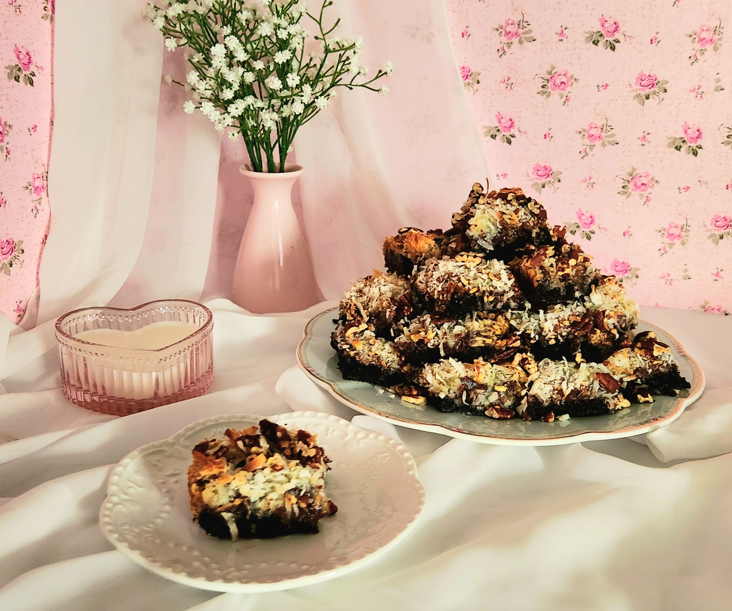 - Place the pan in the oven for 30-35 minutes, flipping halfway through, until the caramel is bubbly and the coconut is golden brown. Allow the slab to cool completely in the pan, then lift it by the parchment paper and transfer it to a cutting board. Using a chef’s knife, cut the slab into a 4×6 grid, leaving you with 24 bars. Store any leftover bars in an airtight container for up to 3 days on the counter, and enjoy!