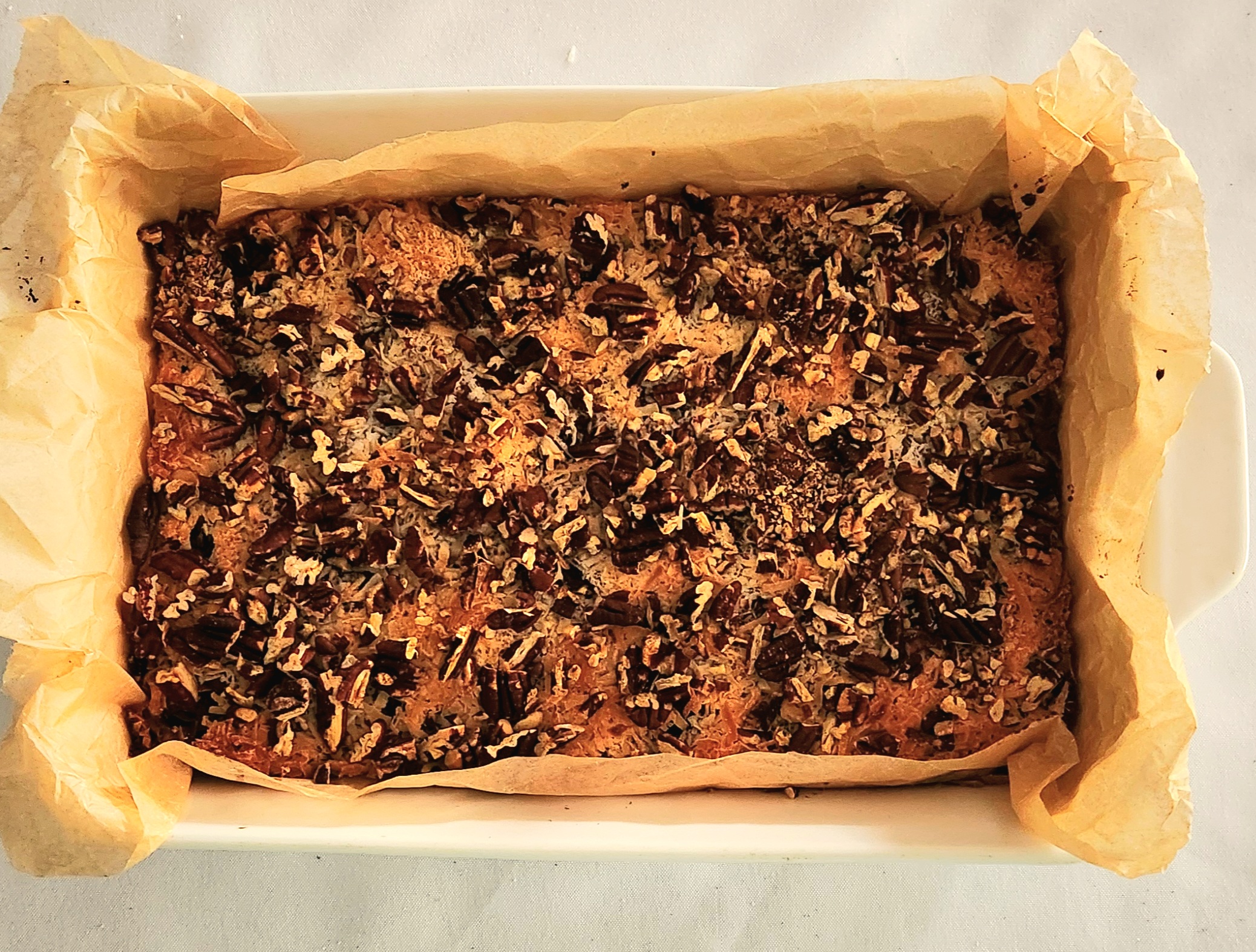 Place the pan in the oven for 30-35 minutes, flipping halfway through, until the caramel is bubbly and the coconut is golden brown. Toasty, caramelized coconut and fully toasted pecans elevate the bars drastically.