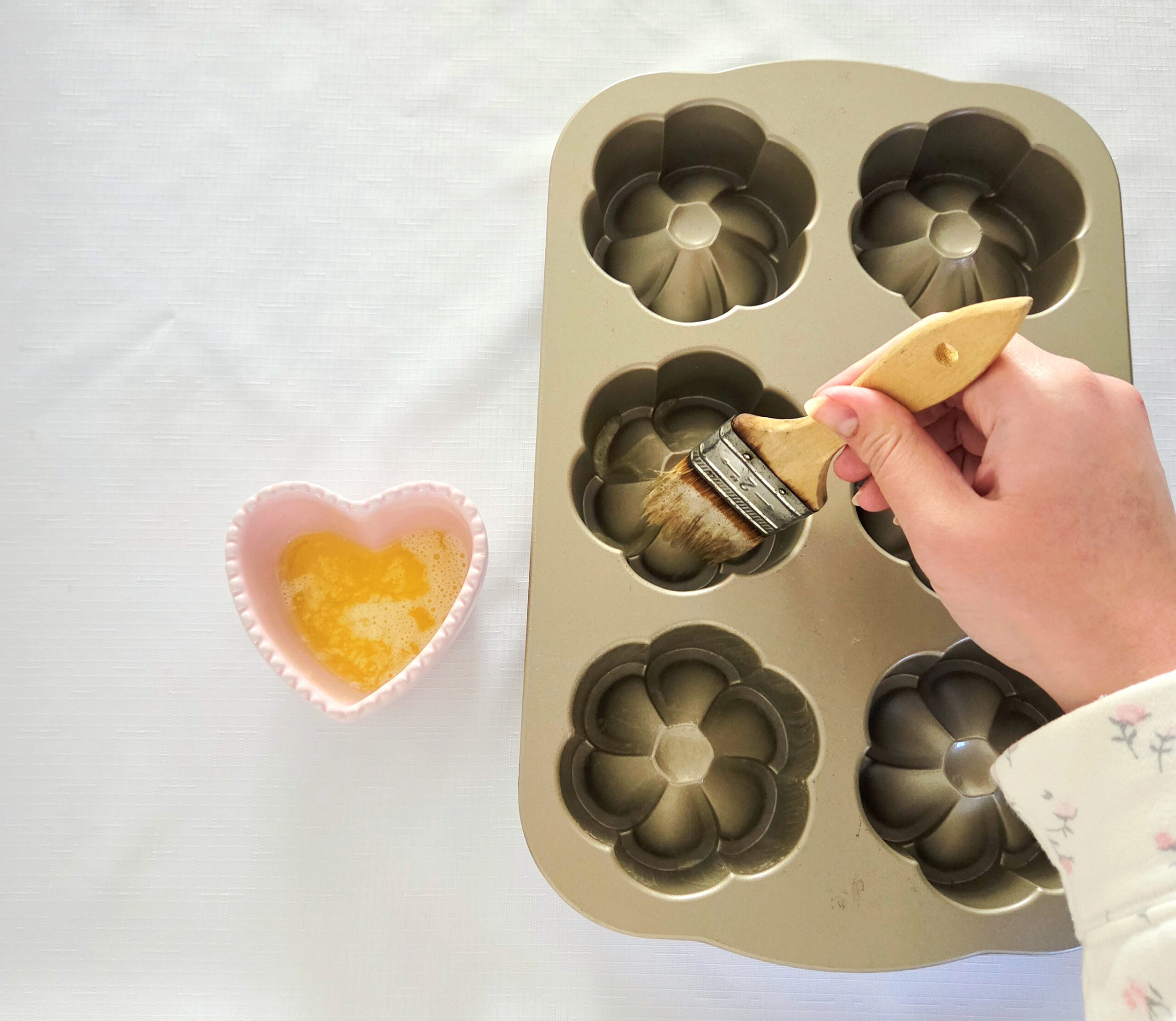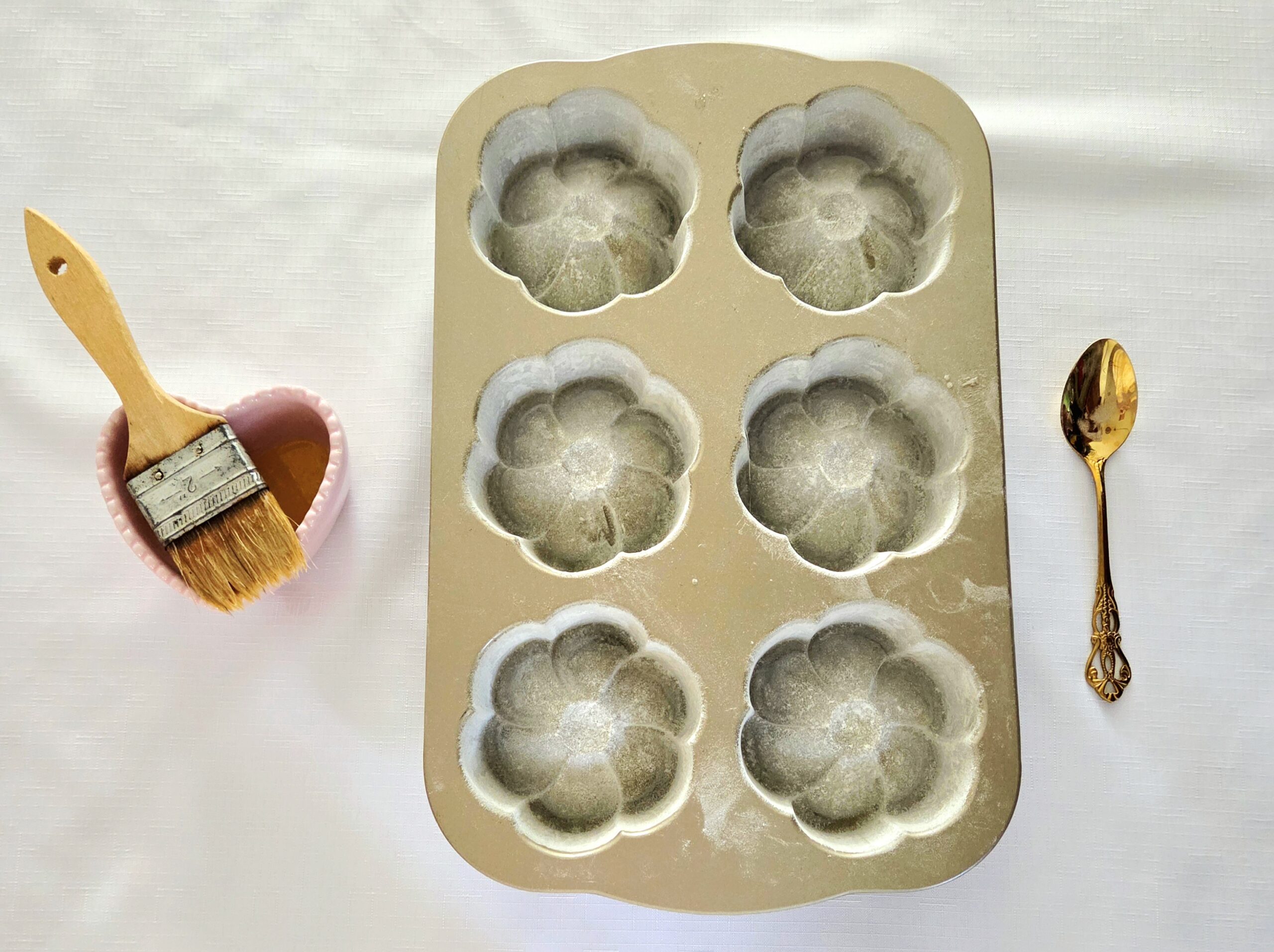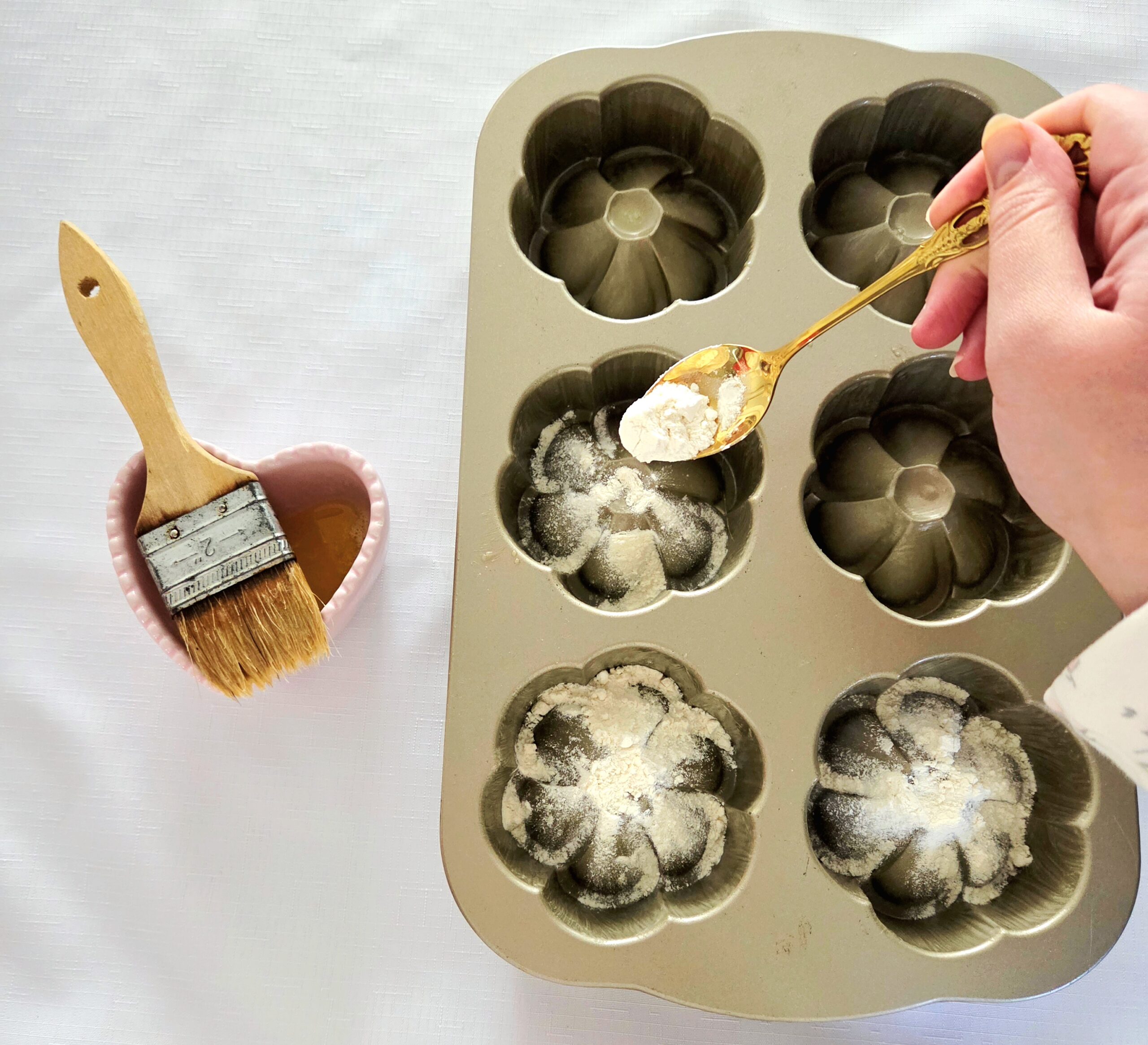 • Use a pastry brush to coat the molds in melted butter. Typically, I’d recommend just rubbing the butter wrapper on the pan for this step, but because of all the crevices in a bundt, I’d strongly recommend melting a Tablespoon of butter in a small dish and brushing it on so you don’t miss anywhere.