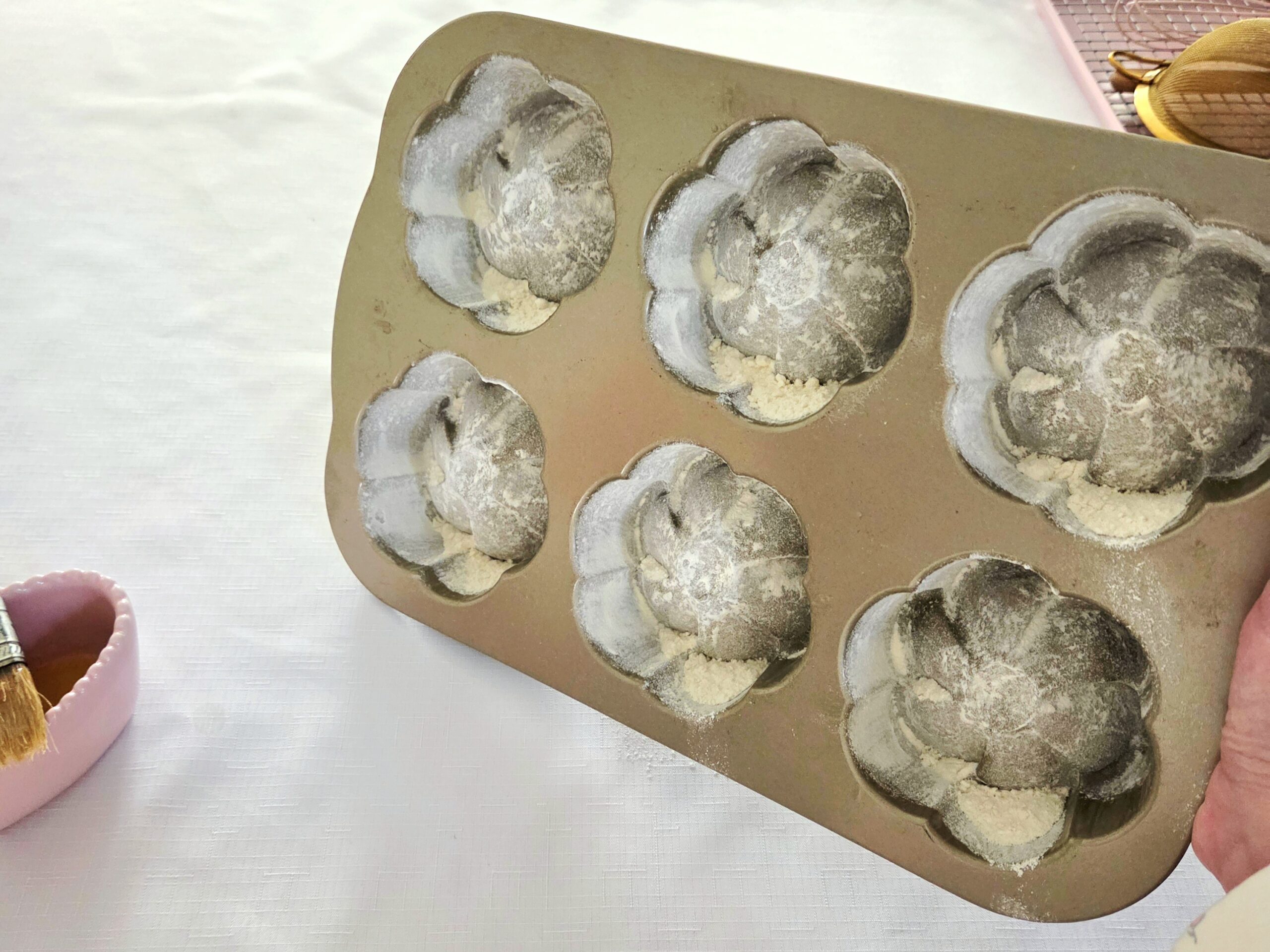 1. Begin by making the batter. Preheat the oven to 350F, on the convection setting if possible, and prepare the pans. If your mini bundt pans are silicone, there’s no additional prep work needed. If they’re metal, either spray them with a nonstick baking spray or coat them with melted butter then dust them lightly with flour, as shown above. Set your pans aside.