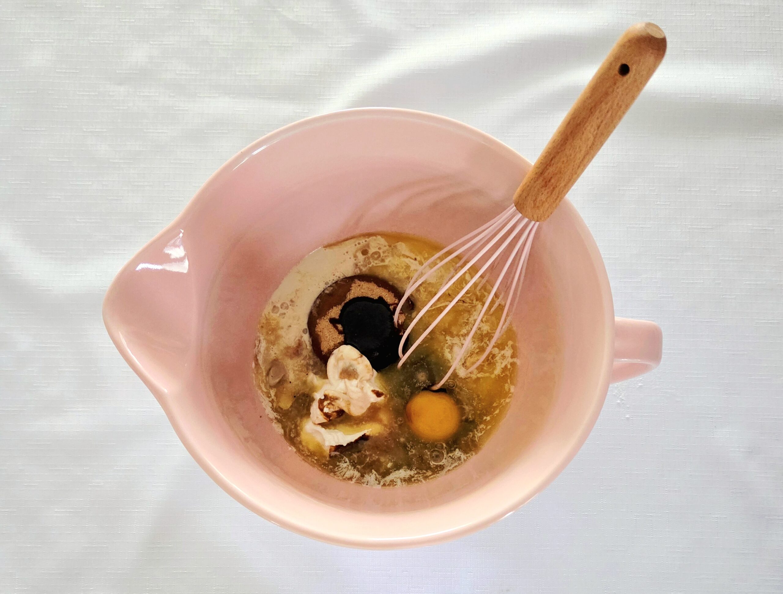 3. In a large microwave safe mixing bowl, melt the butter. Whisk in the brown sugar, molasses, egg, milk, yogurt, and vanilla extract, until they’ve come together as a homogeneous mixture.