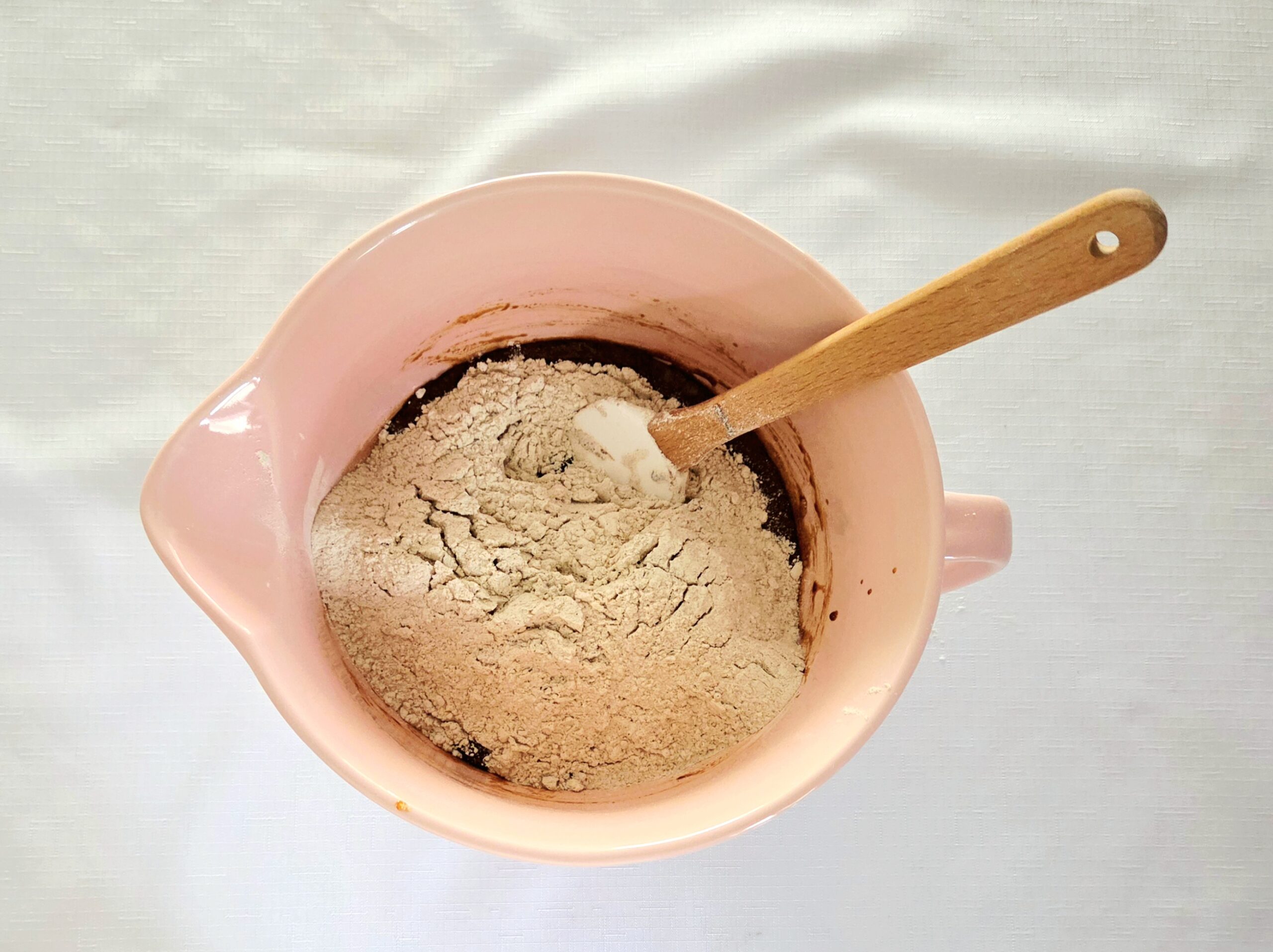 4. Dump the dry goods all at once into the wet mixture and, using a rubber spatula, stir the two together until a smooth batter forms.