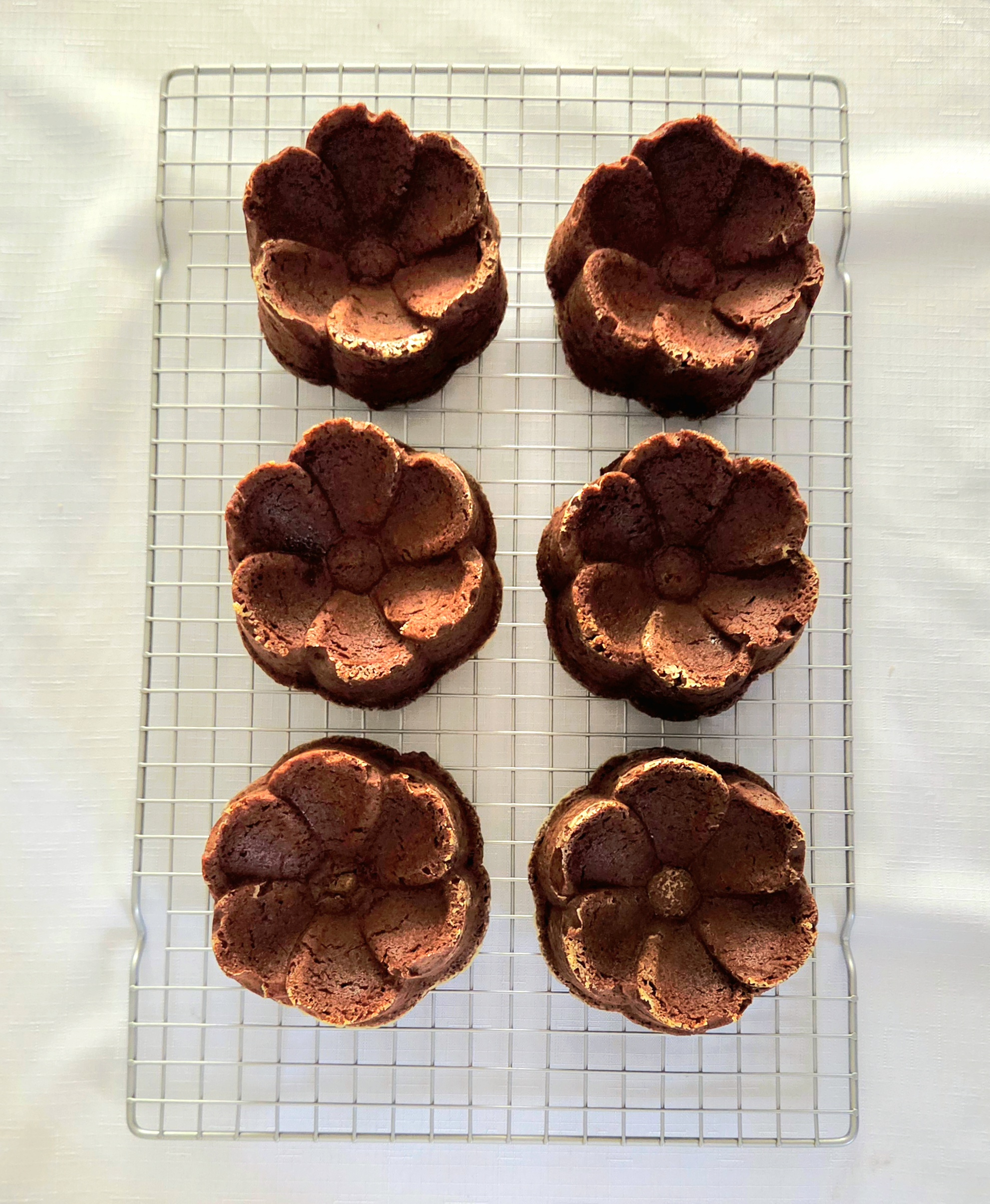 6. When they’ve finished baking, allow the mini bundts to rest in the pans for 5-10 minutes, or until they’re ready to come out without struggle. Gently remove them from the pans and transfer over to a cooling rack to finish coming down to room temperature.