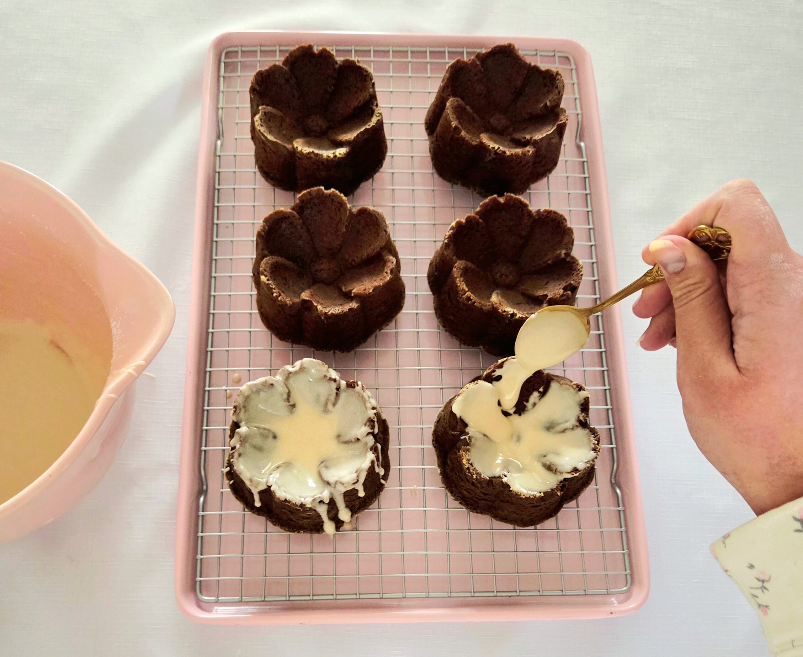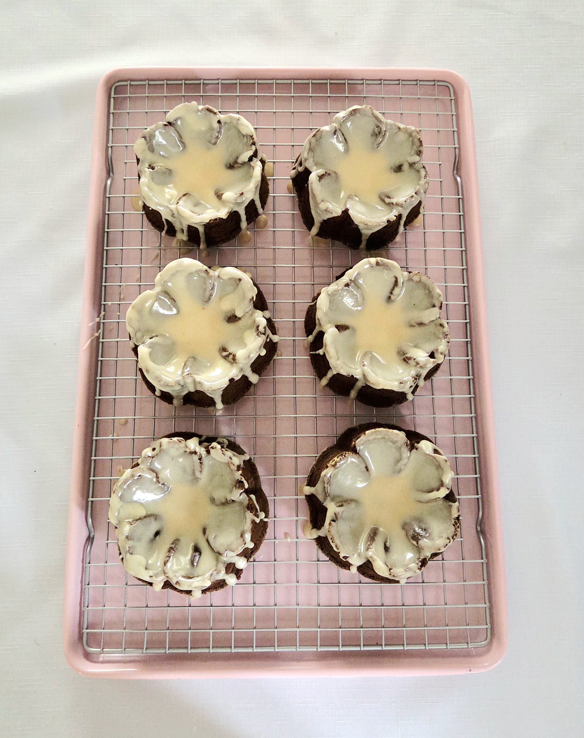 1. Get the gingerbread ready to be glazed. Place the cooling rack the bundts are resting on onto a baking sheet with a rim.
