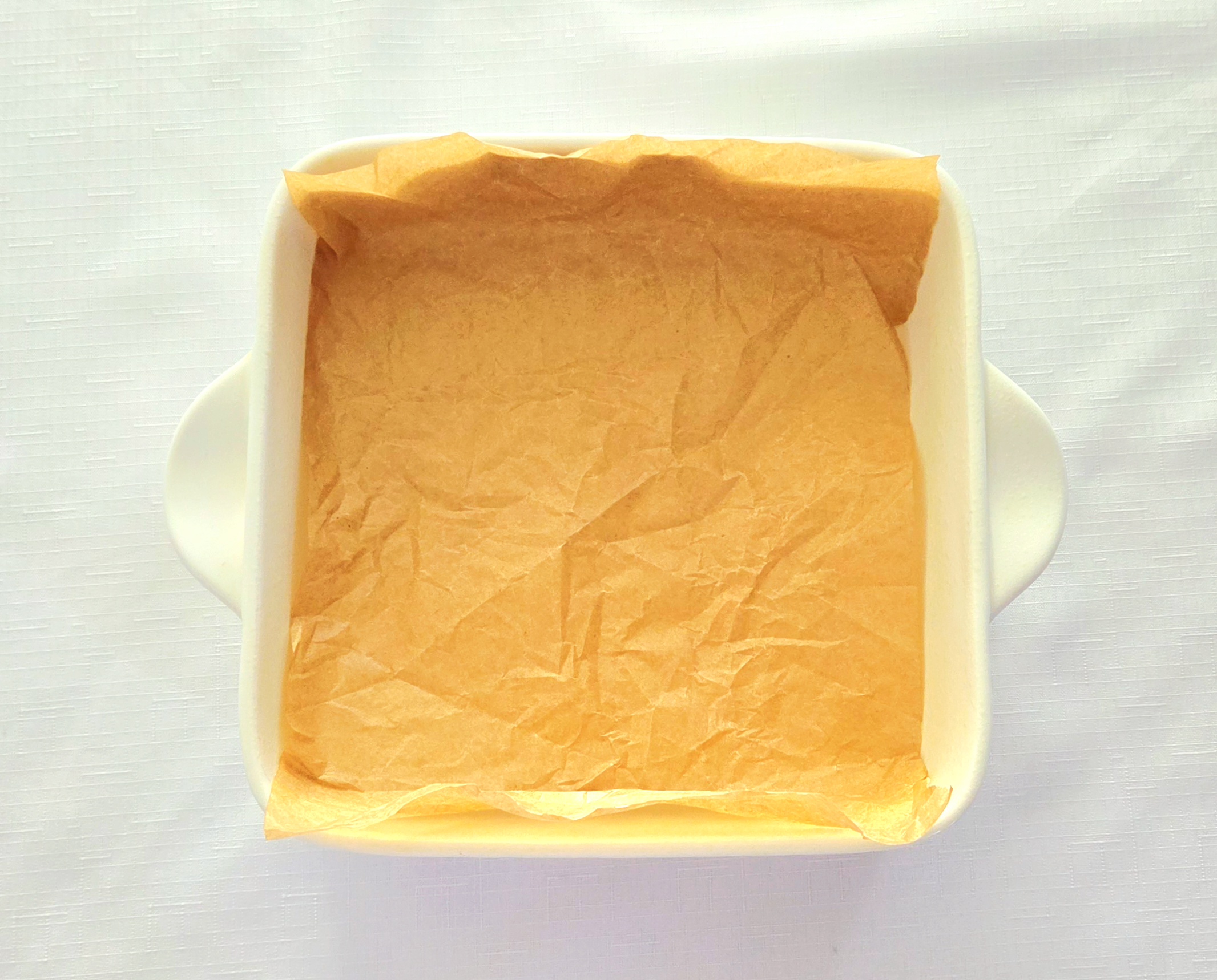 1. Begin by preheating the oven to 375F, on the convection setting if possible. Line the bottom and up two sides of an 8×8 inch baking dish with parchment paper, and spray the two uncovered sides with a nonstick baking spray. Set the dish aside.