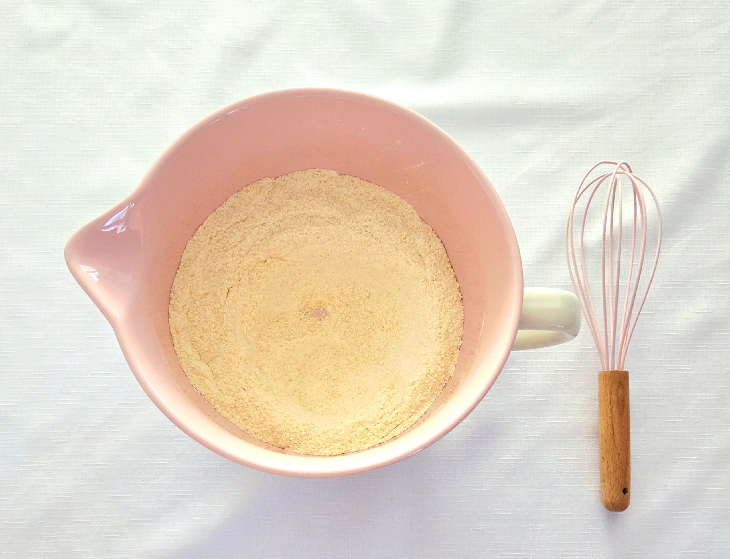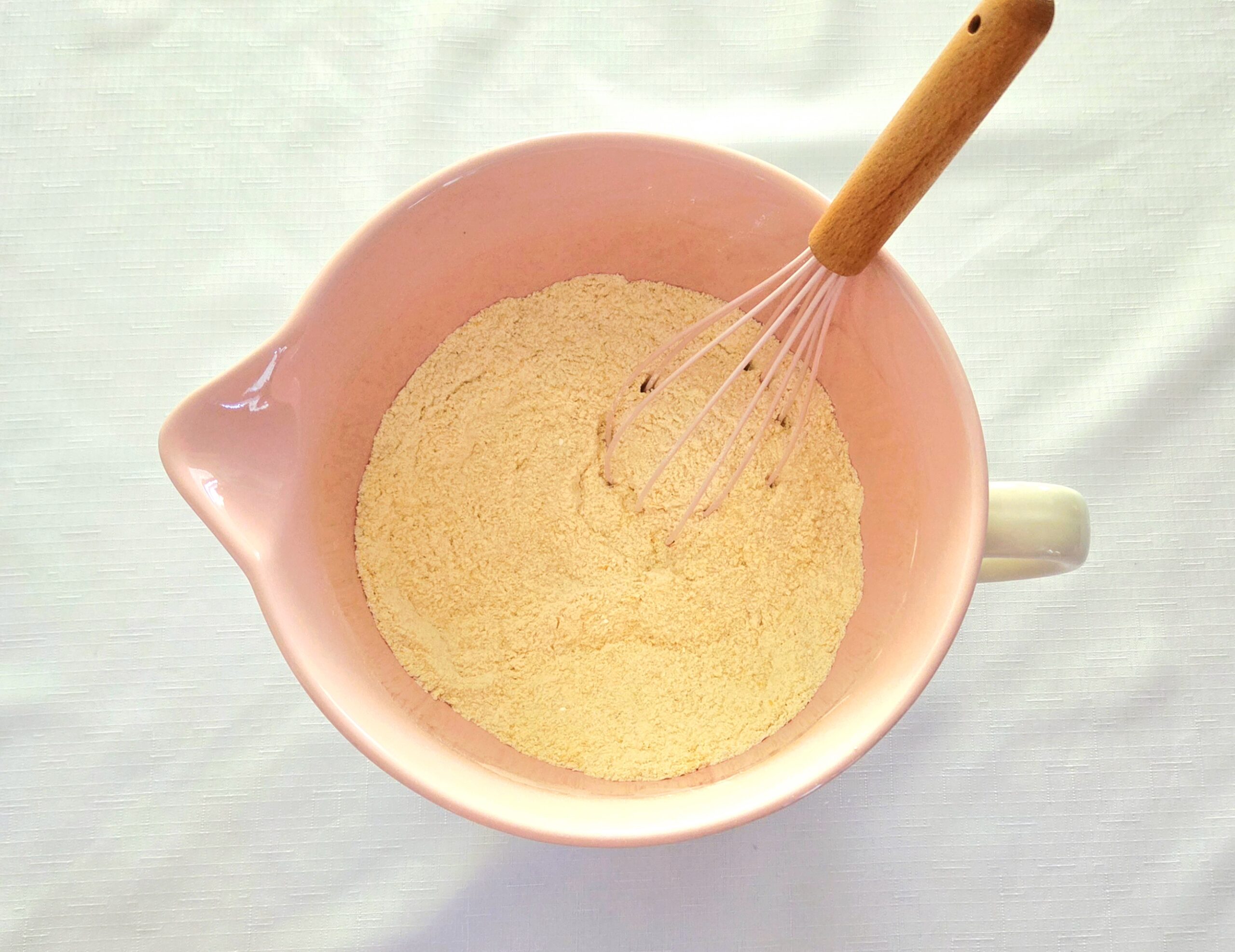 Now, start with the dry goods. Whisk together the flour, cornmeal, sugar, baking powder, and salt. The finer the cornmeal is, the less grit you’ll feel in the final product. Take one of the dry measuring cups and create a well in the center of the dry mix. This way, it’ll be easier for the liquid mixture to reach the bottom of the dry, which in turn makes it easier on yourself to create a fully hydrated batter.