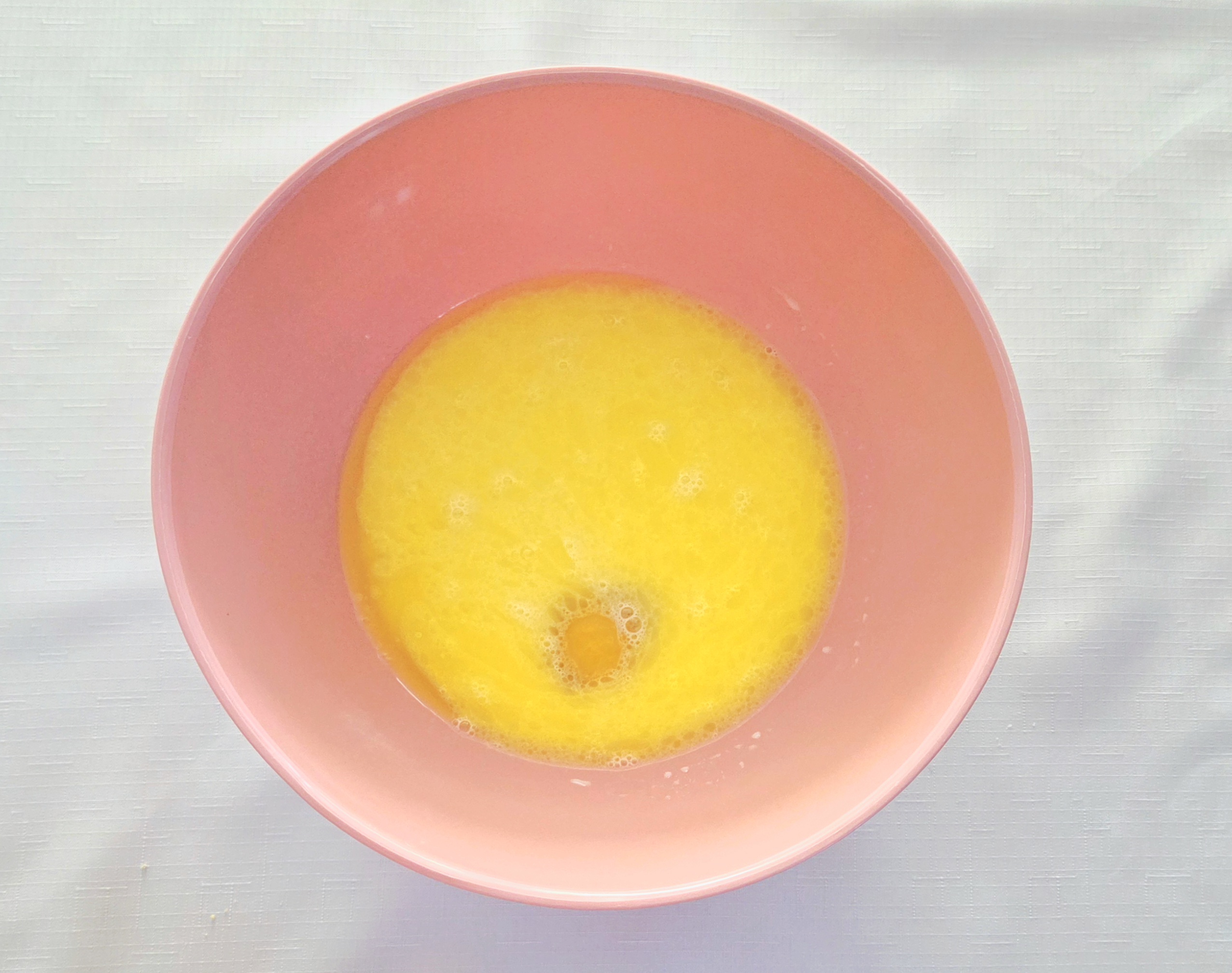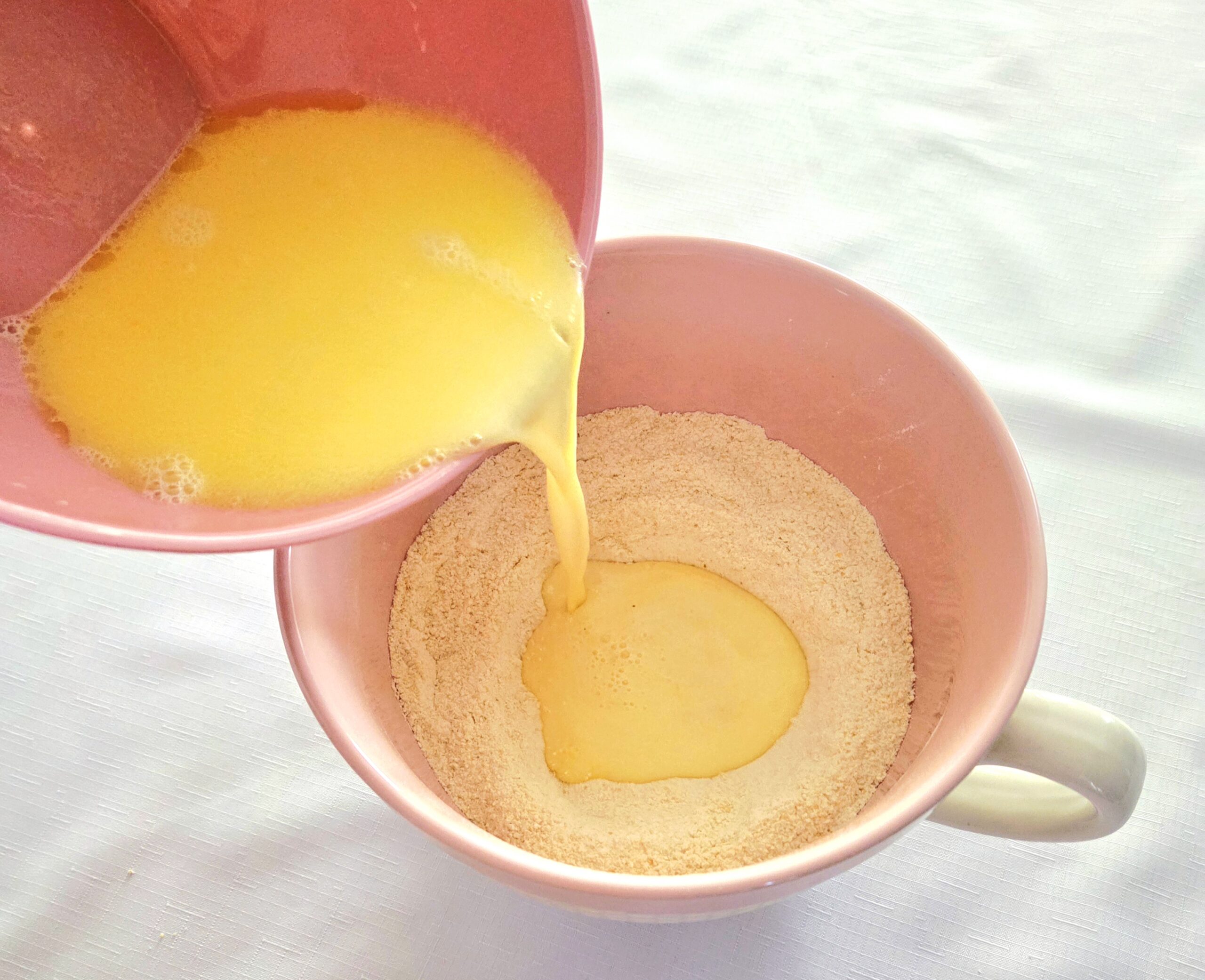 3. Inside a medium heat-safe mixing bowl, heat the butter in the microwave until it’s just melted. Warm the milk in the microwave while it’s still in the measuring cup for 60-90 seconds, stirring every 30 seconds to distribute the heat evenly. Pour the warm milk into the melted butter, crack the egg into the bowl, and whisk them all together.
