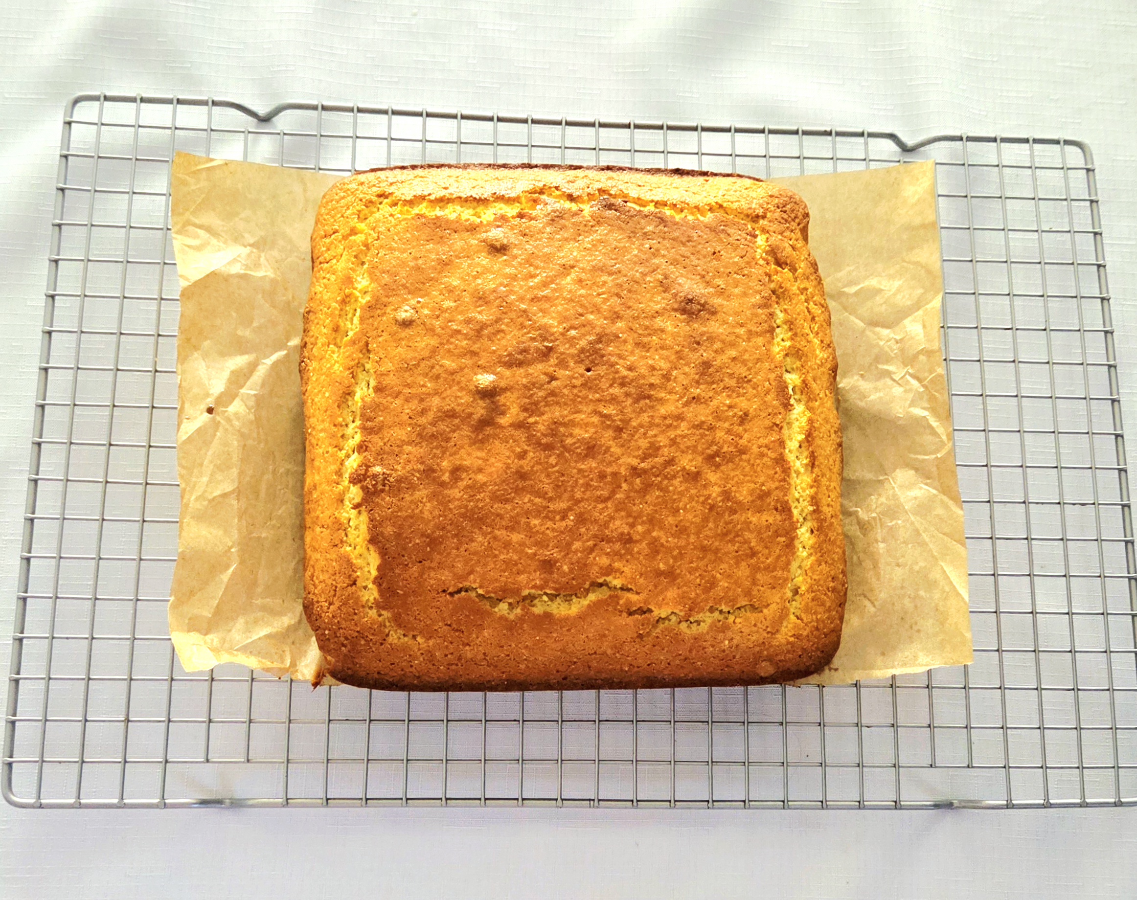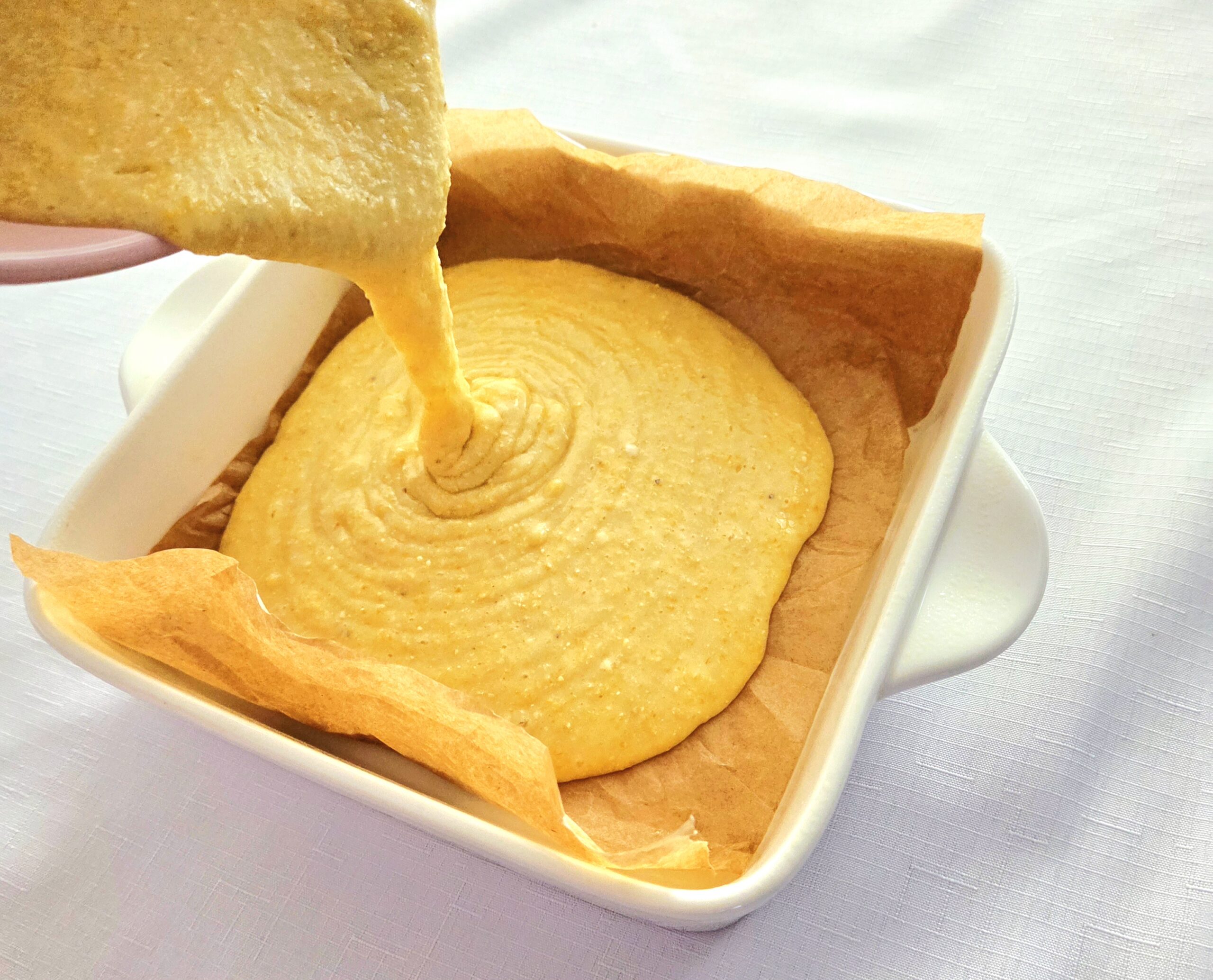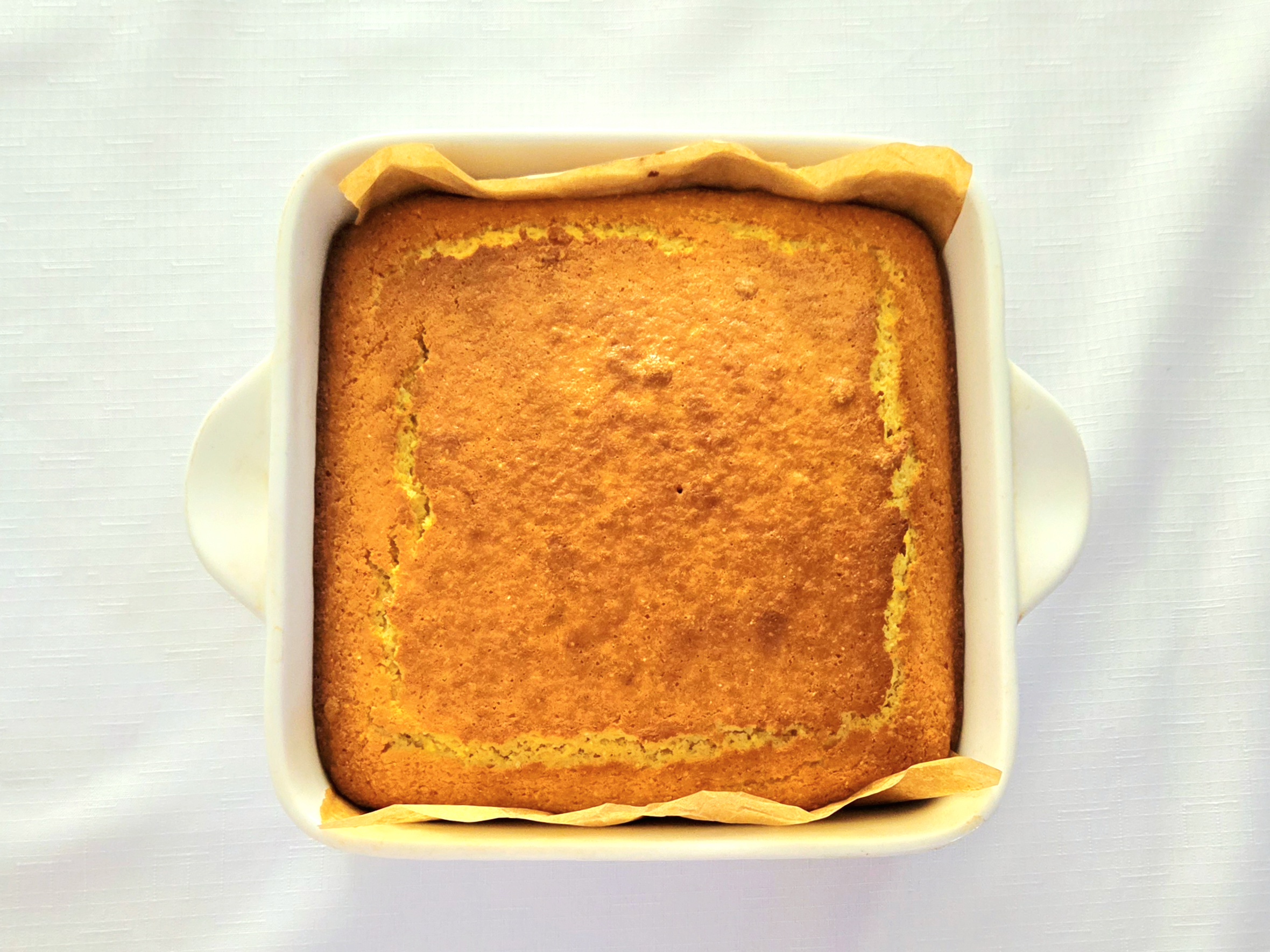 Grab the lined baking dish and pour the batter into it. Scrape as much of the batter into the pan with the spatula as you can, and spread it out evenly throughout. Bake the cornbread on the center rack of the heated oven for 32-35 minutes, or until a toothpick poked in the center comes out clean and the top is golden brown. Flip the pan halfway through, to help it bake more evenly.