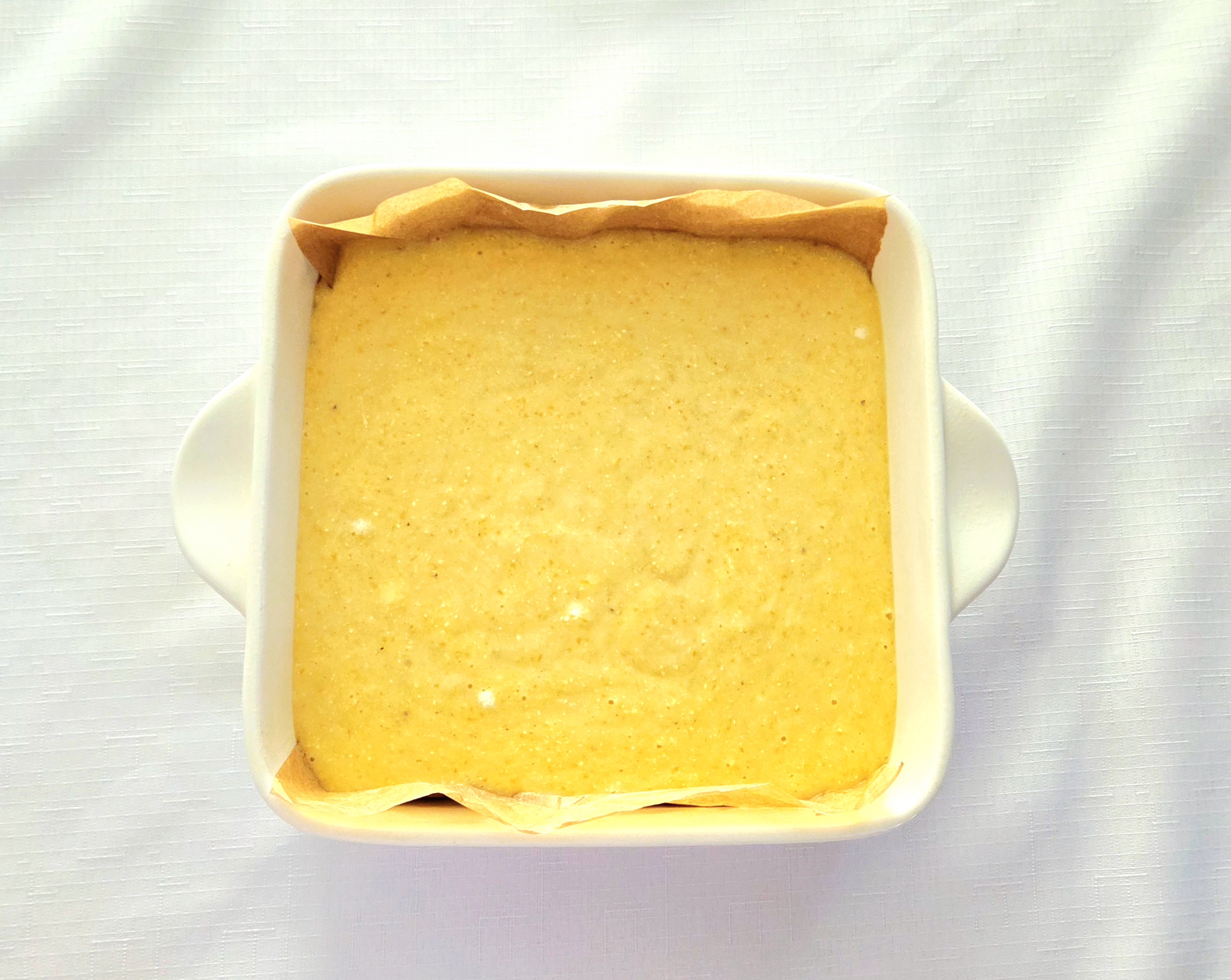 5. Take the completed batter and pour it into the lined baking dish. Scrape as much of the batter as you can into the dish, using the rubber spatula. Place the cornbread onto the center rack of the oven and bake for 32-35 minutes, flipping halfway through, until a toothpick poked in the center comes out clean.