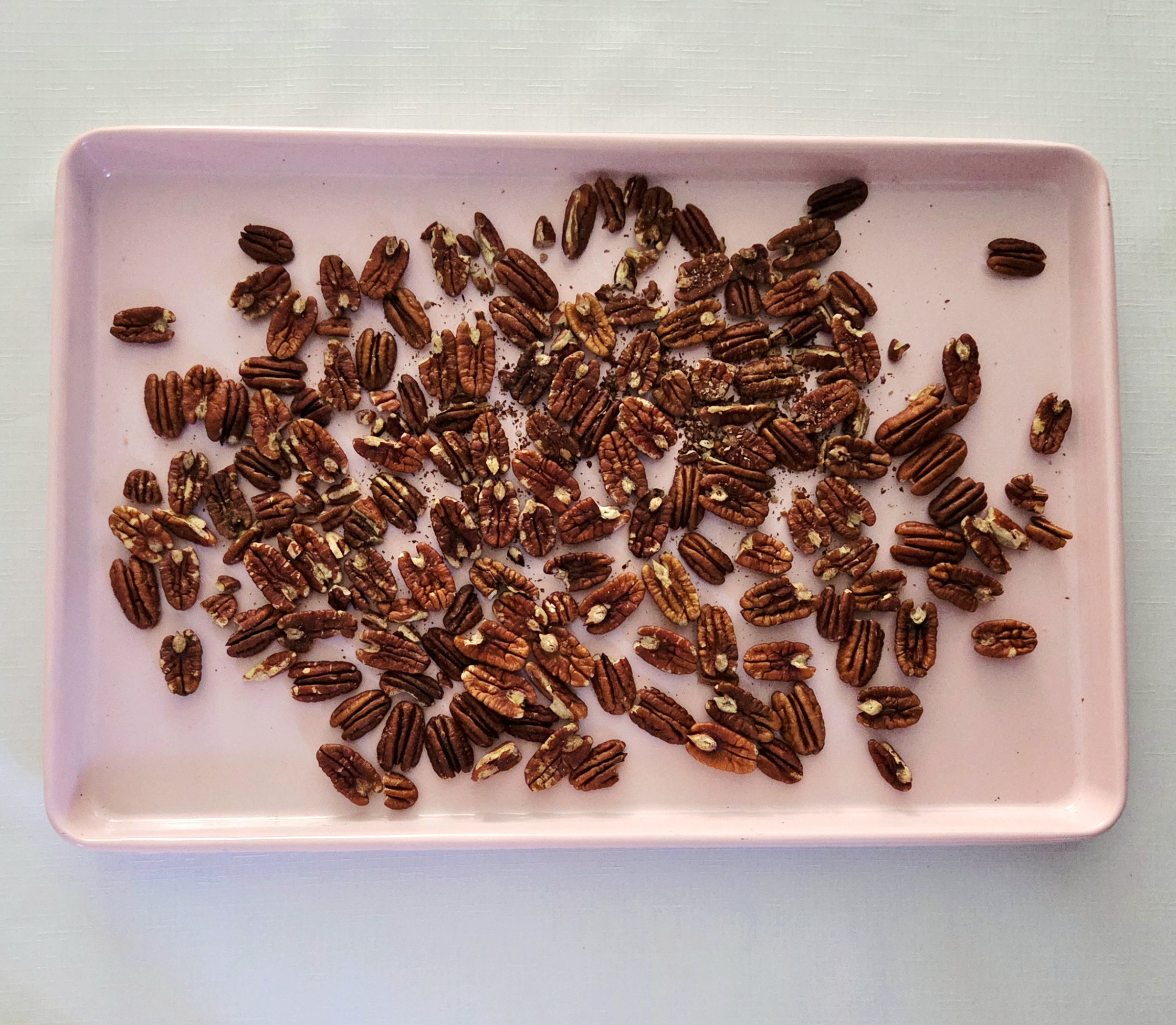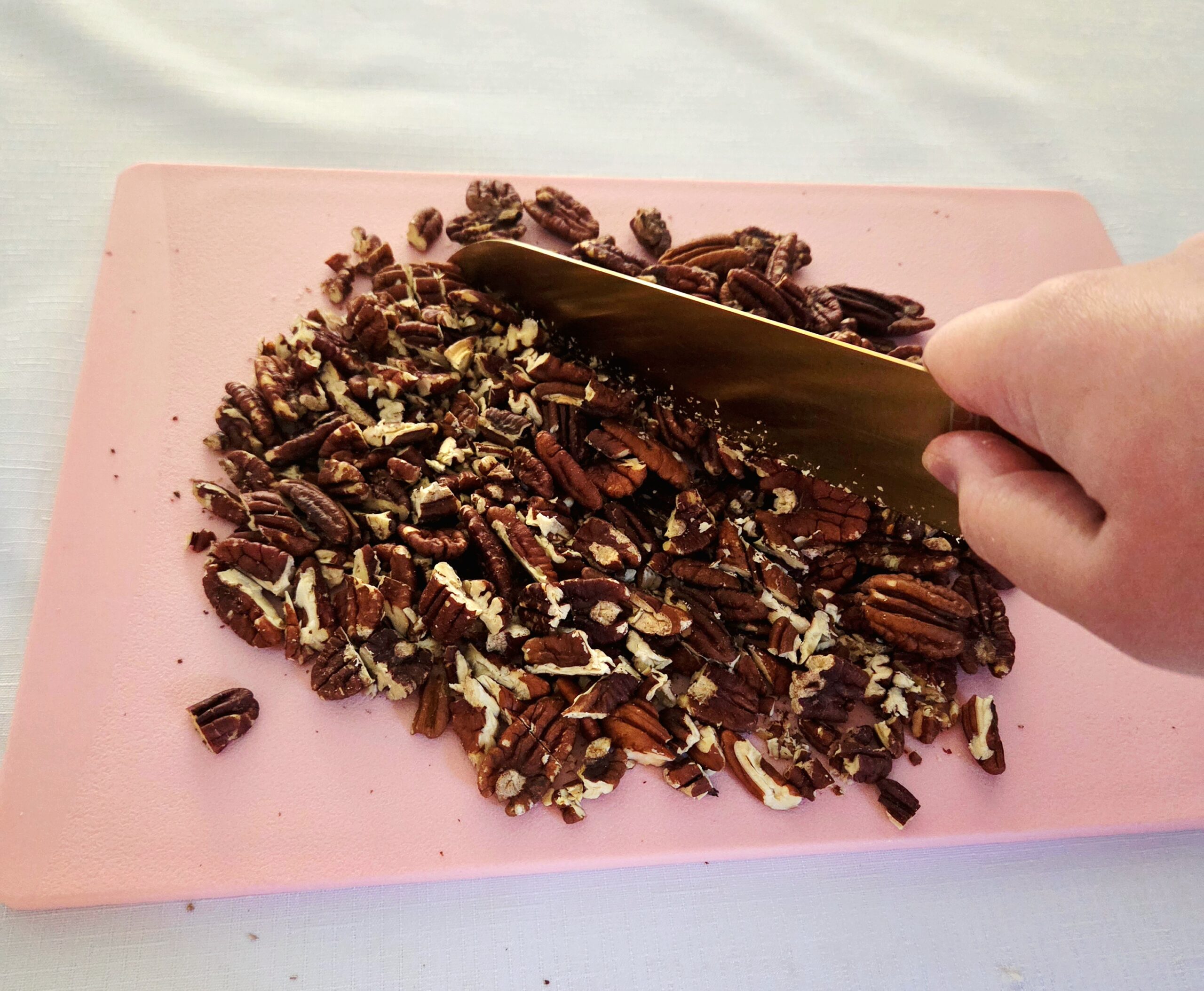 Once the pecans have cooled down, move them onto a cutting board and, using a chef’s knife, give them a rough large chop.
