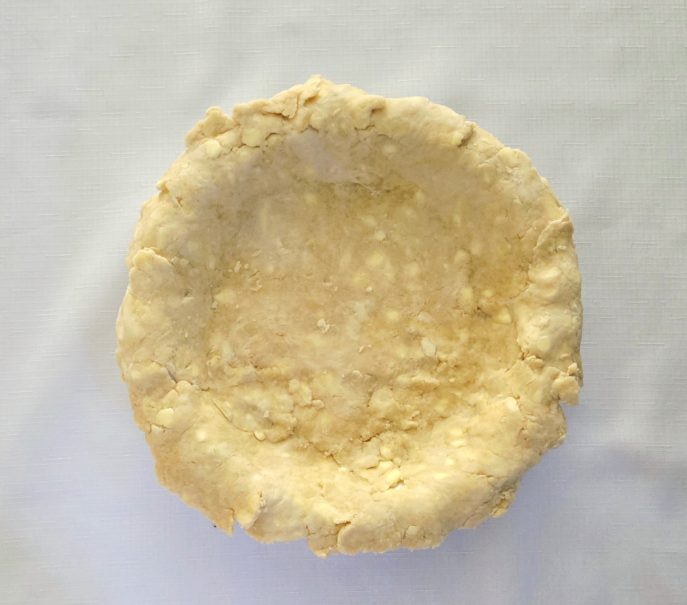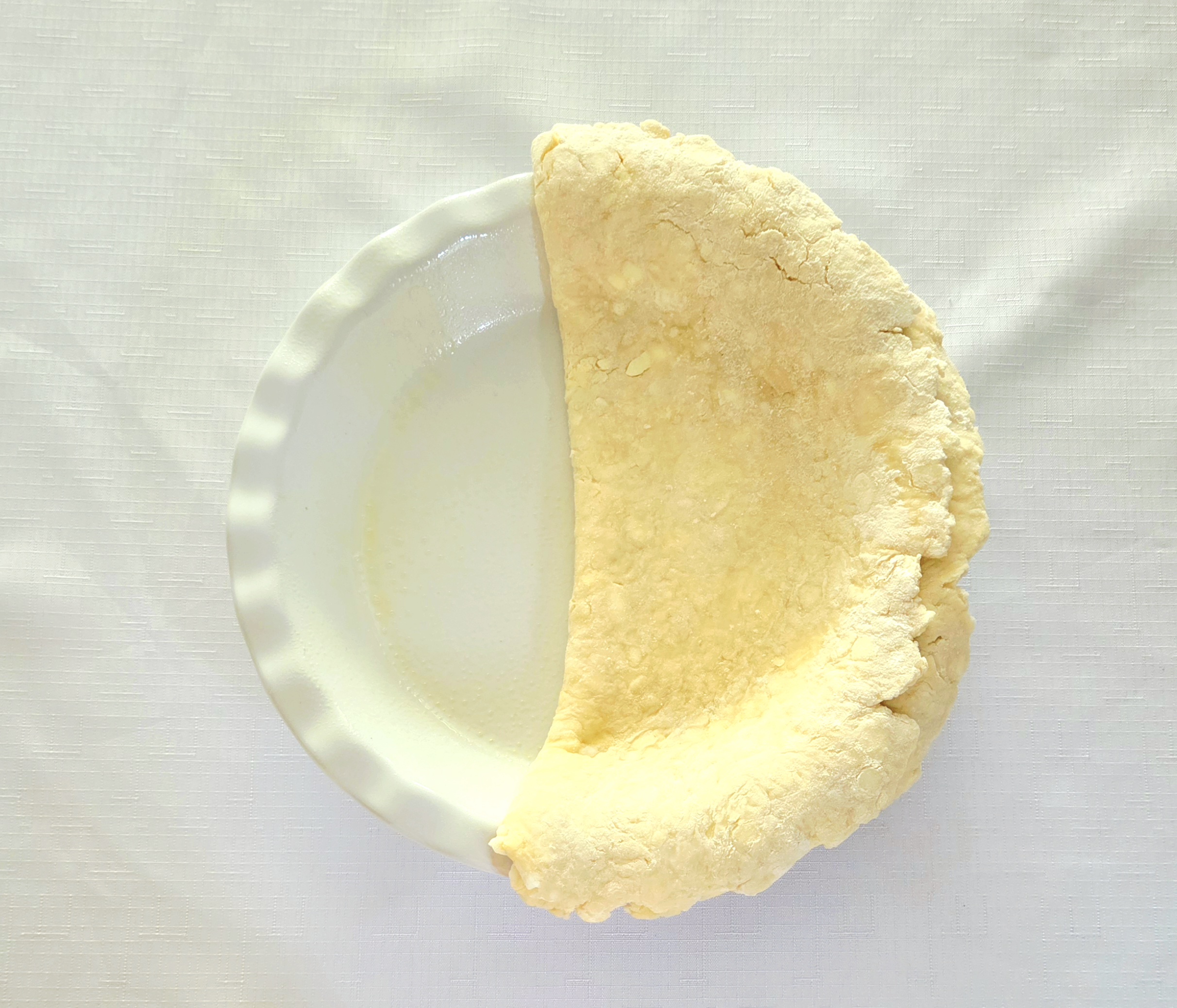 3. Fold the circle of dough in half, and transfer it over to the pie dish. Gently unfold it, and fit the dough snug into the pie dish. Make sure it’s touching the bottom and sides, and tucks into the crease where the bottom and sides meet. Trim anything hanging over the sides of the pan with a paring knife or kitchen scissors. Tuck the edge of the dough about 1/2 inch underneath itself, and press down gently to seal it.