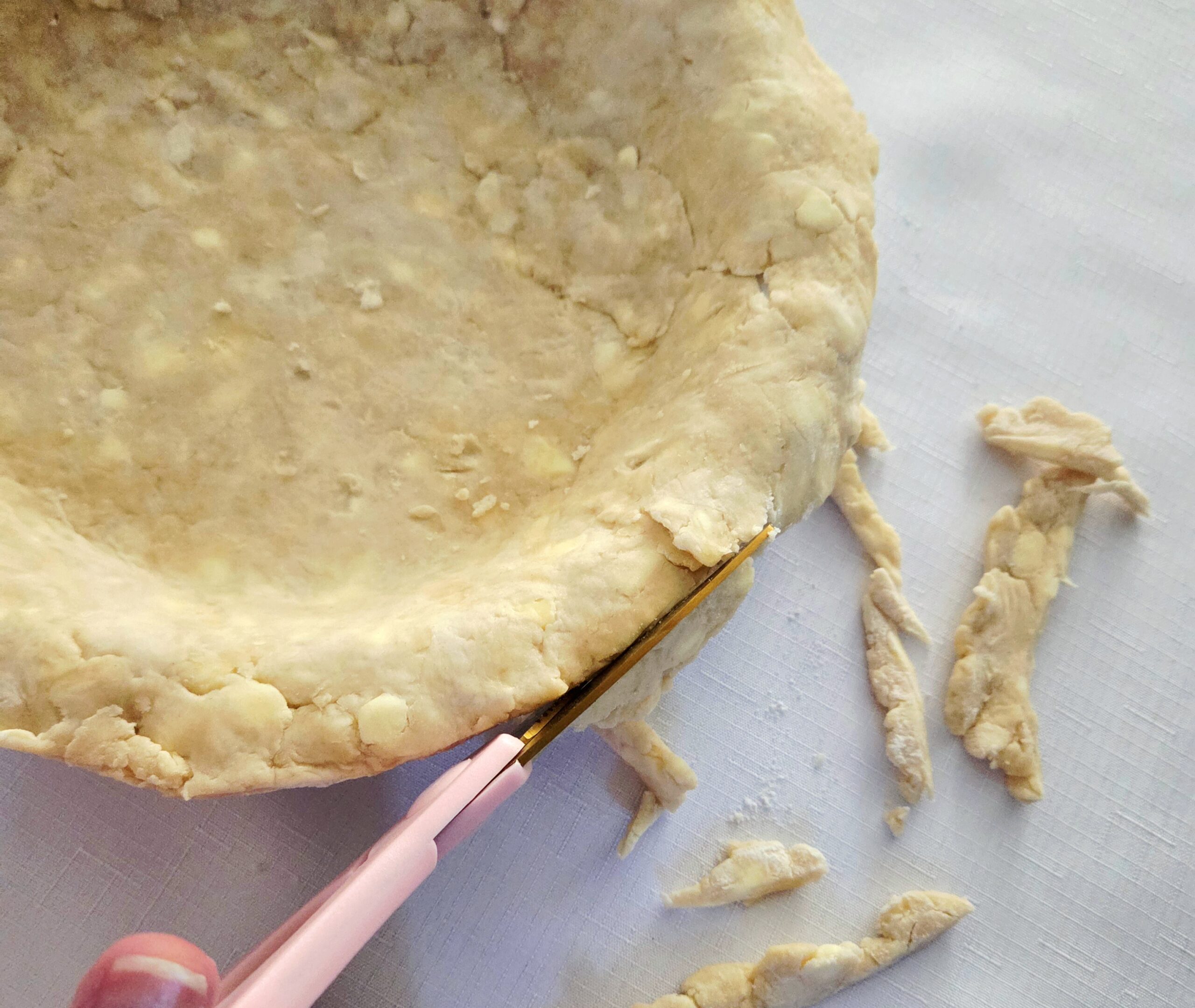 Trim any extra hanging over the sides of the pan with a paring knife or kitchen scissors. Tuck the outer rim of the dough underneath, by no more than 1/2 an inch, and press down gently to seal it. This will make the crimped edges prettier, but thickening the outer crust in this way makes it less likely to burn.
