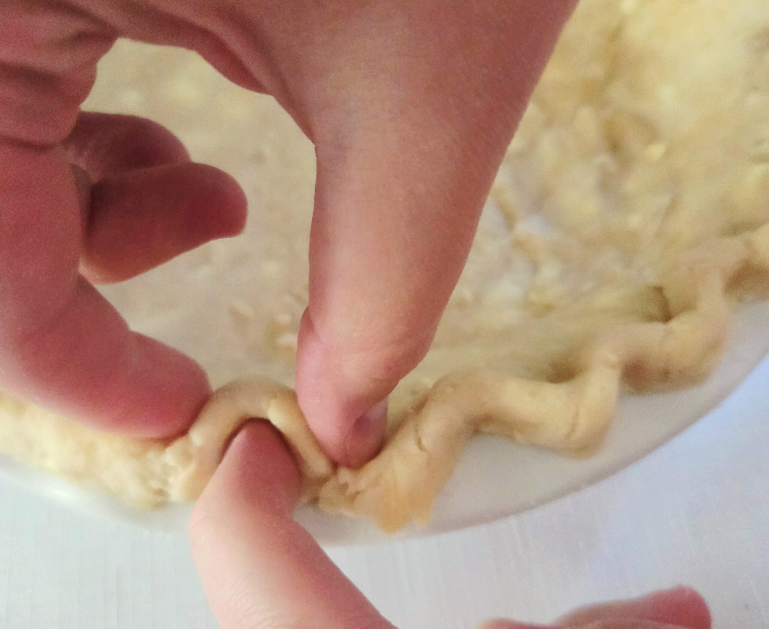 5. For a slightly fancier crimp, take your pointer finger and thumb on one hand and hold them about an inch apart. Gently press them against the sides of the rim of dough and use the pointer finger on the opposite hand to make a moderately deep impression in the space between your two fingers. Start the next finger crimp by placing your pointer finger against the previously made indent, and repeat the same actions as before. Repeat this process all the way around the rim. See reference photos above.