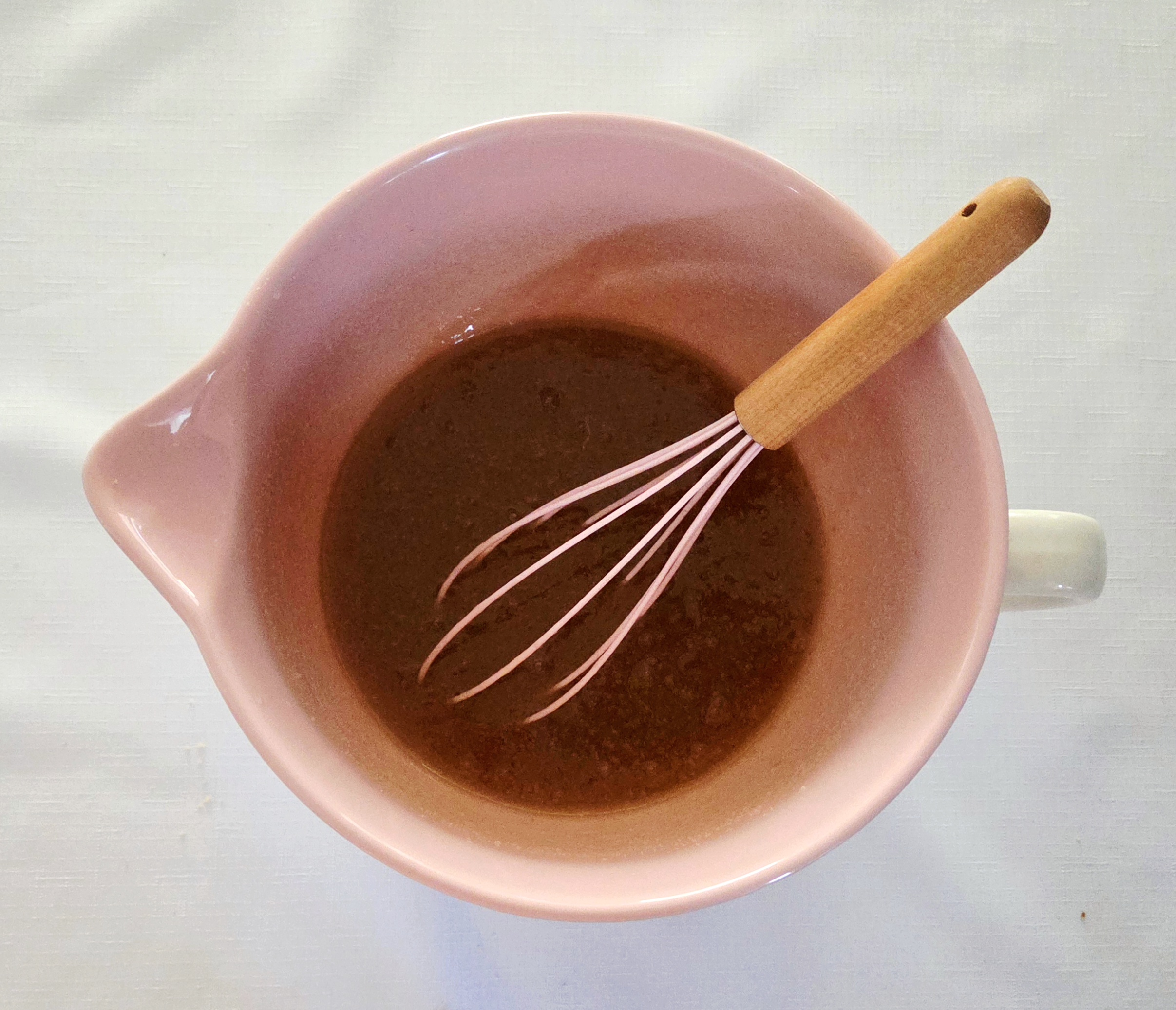 2. In a large microwave safe mixing bowl, heat the butter until it’s just melted but not hot. Whisk in the granulated sugar, brown sugar, corn syrup, salt, vanilla, and eggs.
