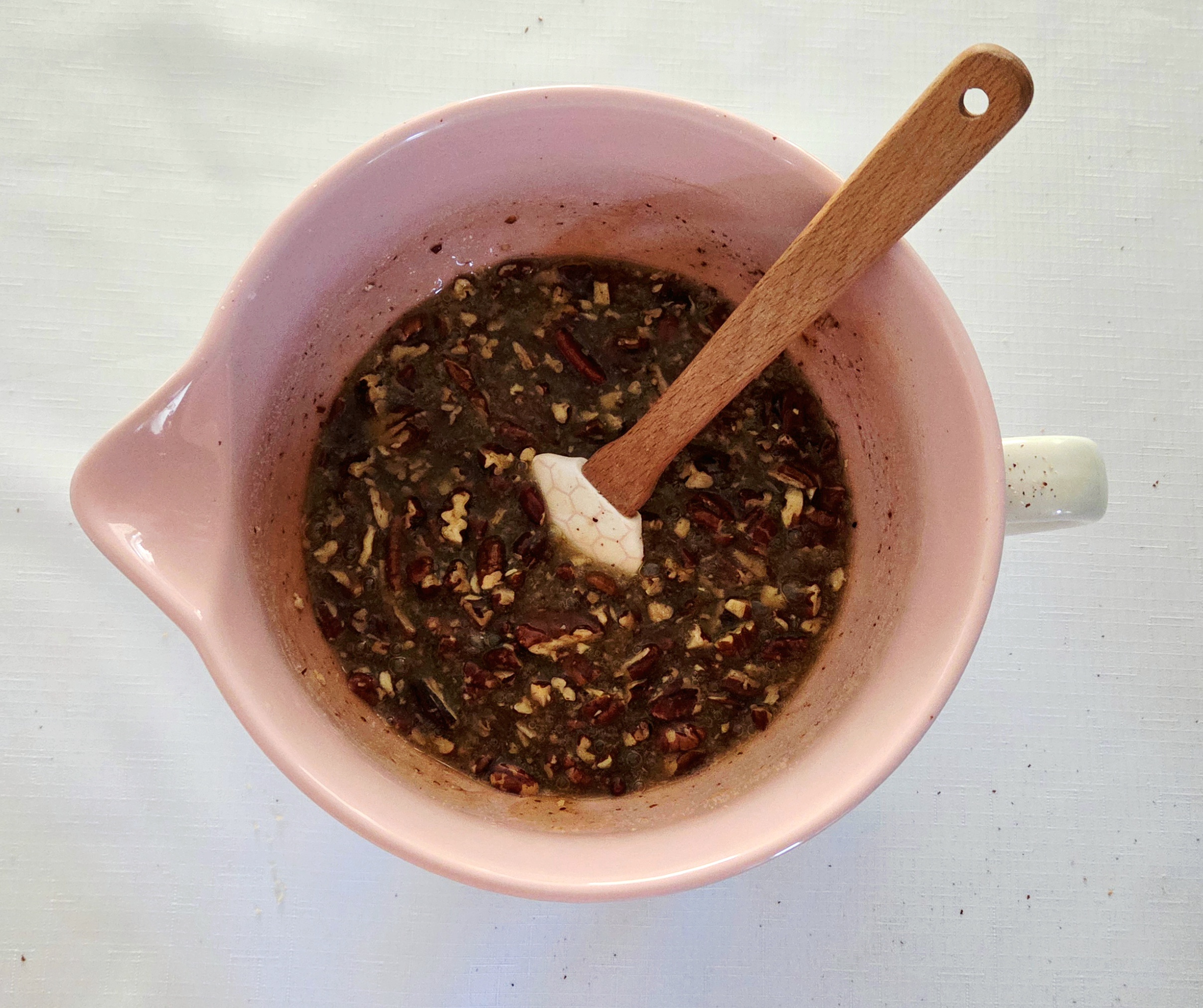 4. Pour the pecans into the rest of the filling and stir them in using a rubber spatula. Transfer the filling into the par-baked crust. Scrape the sides of the bowl with the spatula, to get as much of the filling in as possible.