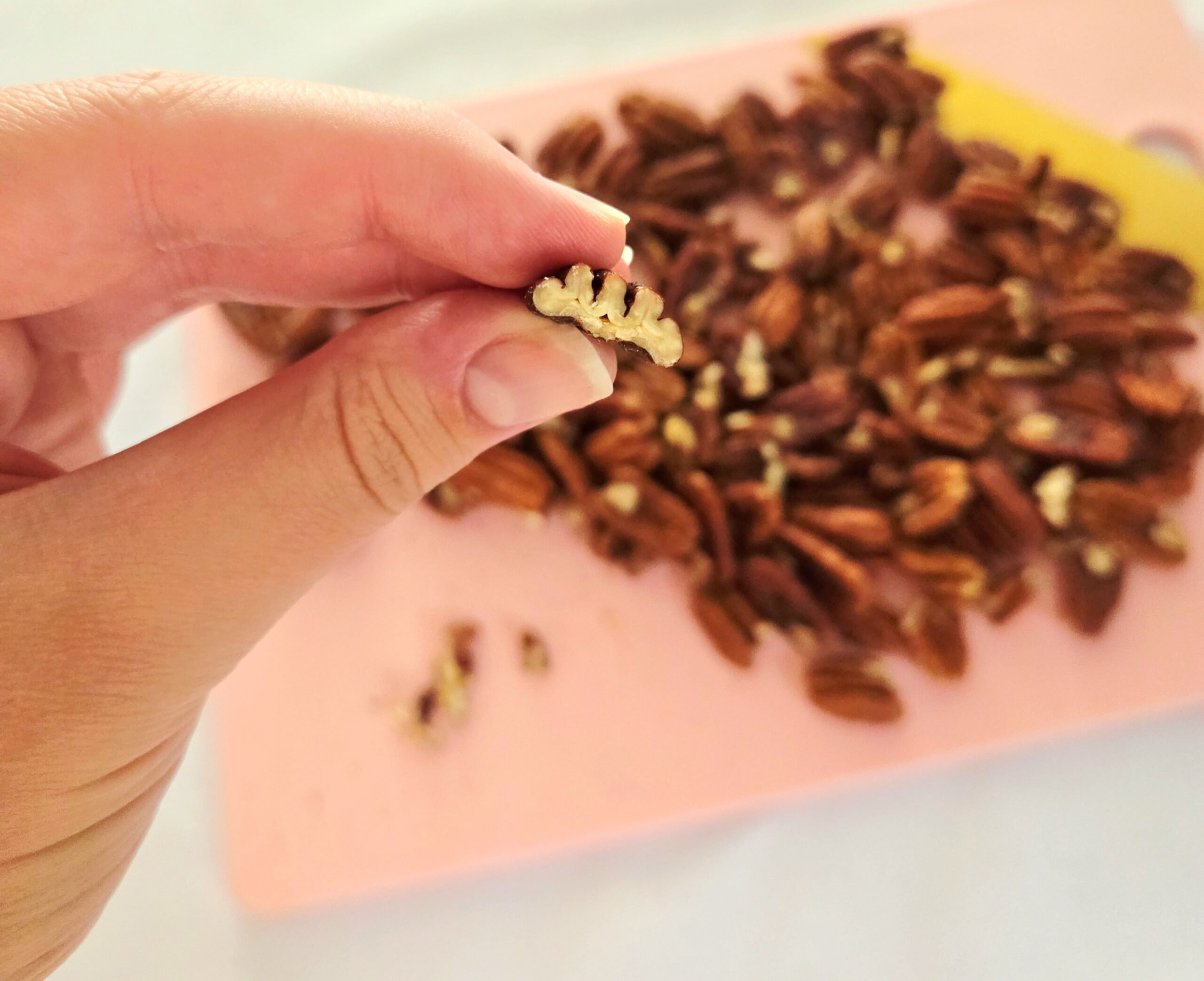 3. Once the pecans have cooled down, move them onto a cutting board. Using a chef’s knife, give them a rough chop.