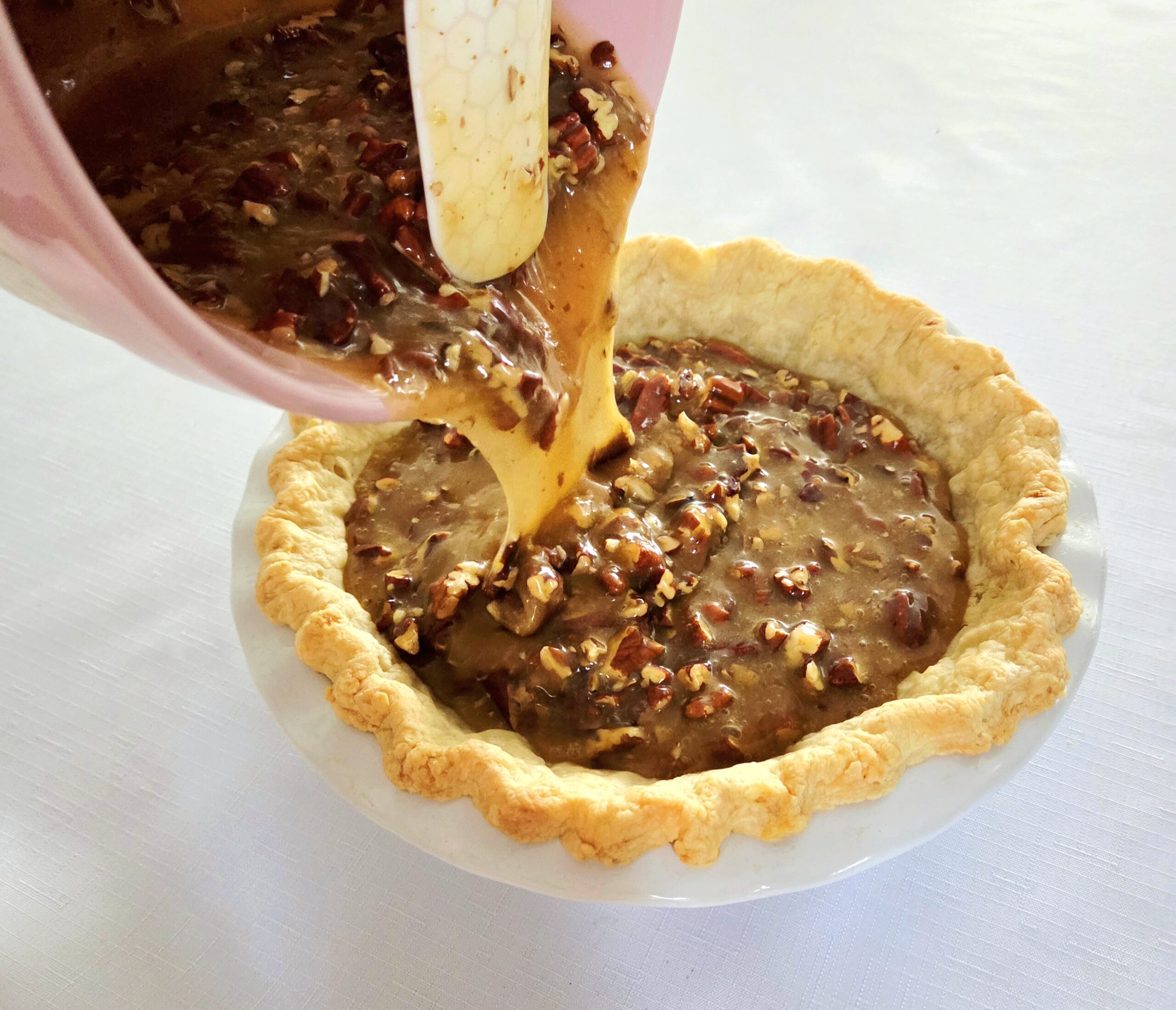 Pour the pecans into the rest of the filling and stir them in using a rubber spatula, then pour the filling into the par-baked crust, scraping the sides of the bowl with the spatula to get as much of the filling in as possible.