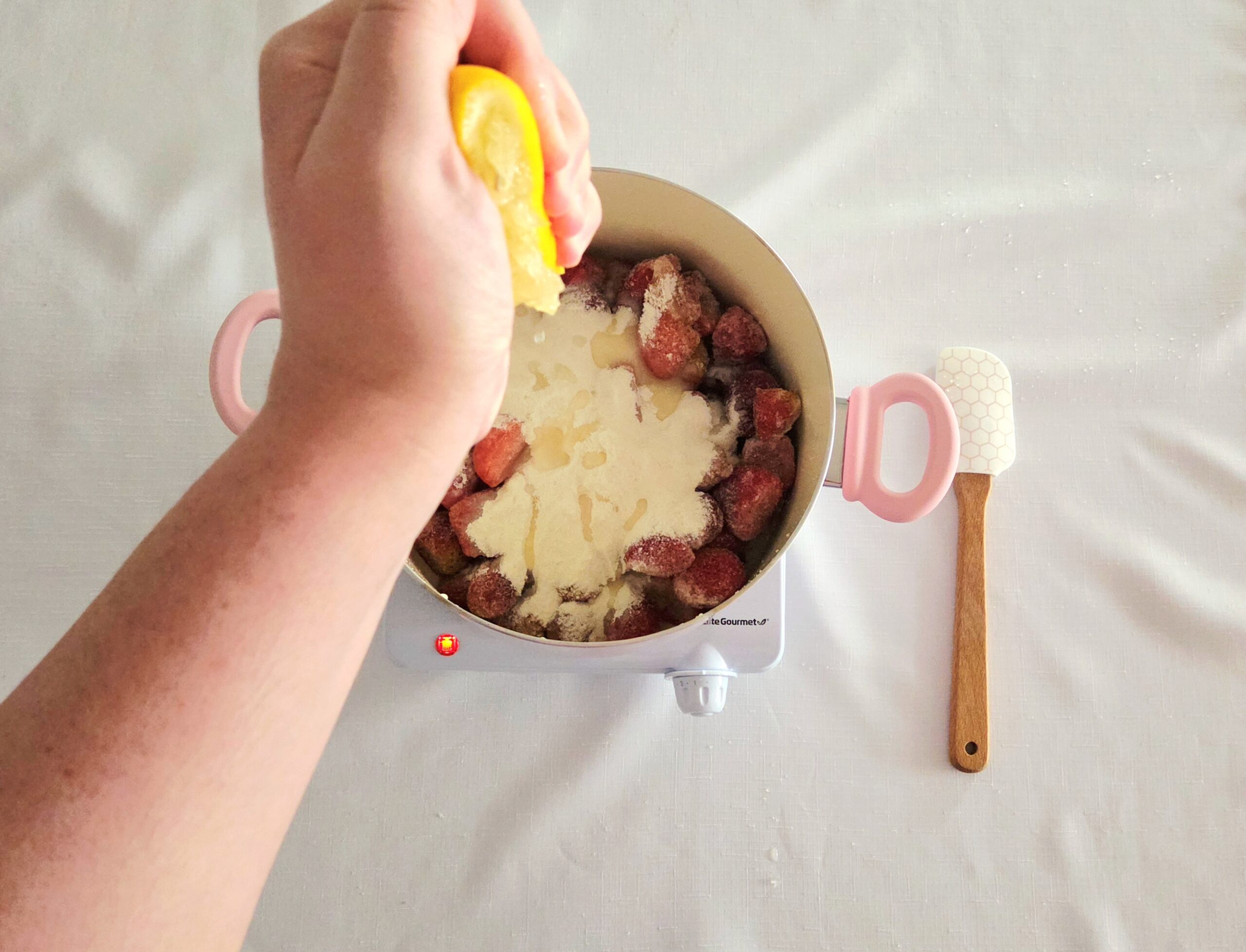 In a 4-quart heavy bottom sauce pan, add the strawberries, lemon juice, and sugar mixture. Place the pan over medium heat and, using a heat safe rubber spatula, stir to coat the strawberries. Cover the pan with a lid, and allow it to heat undisturbed for a few minutes.