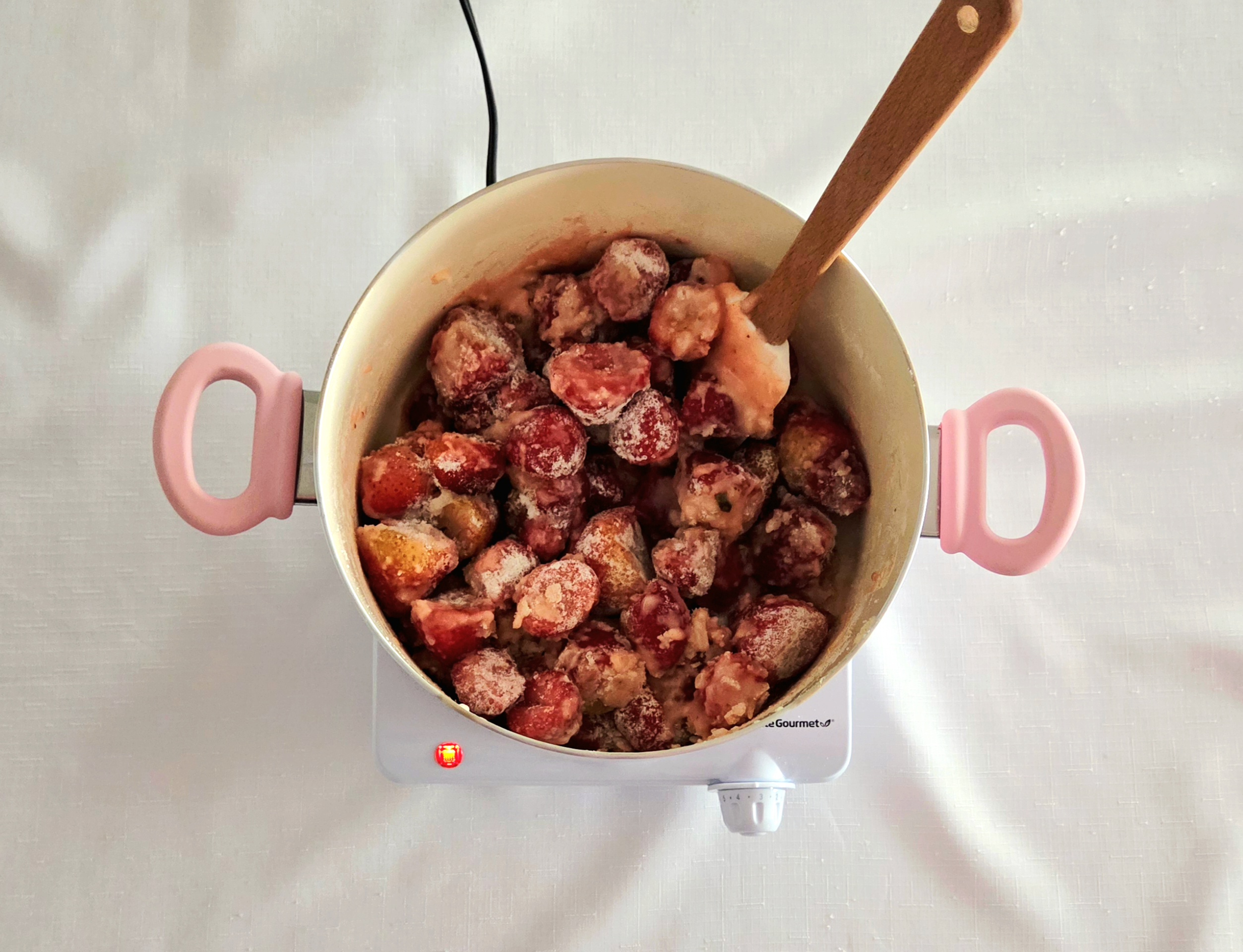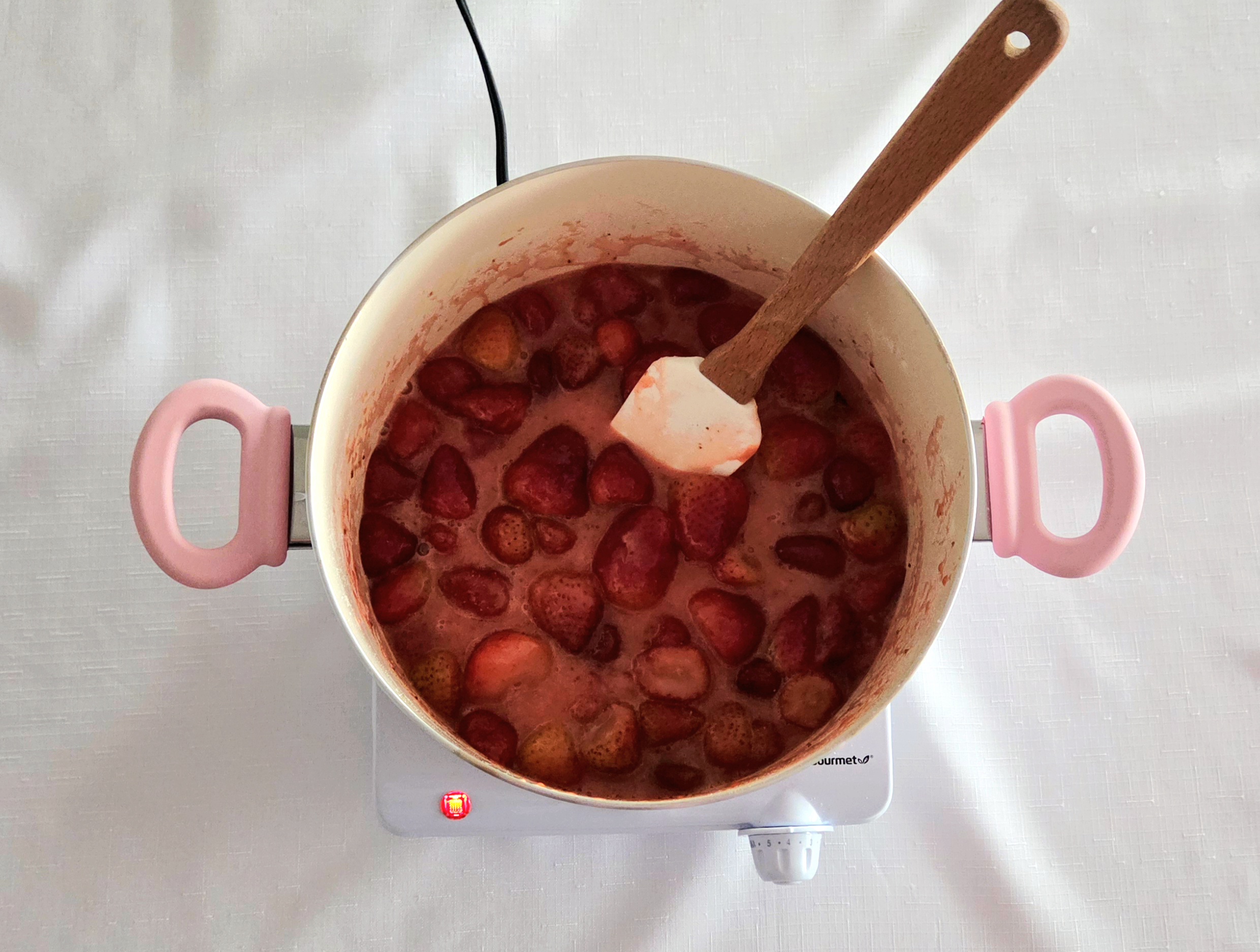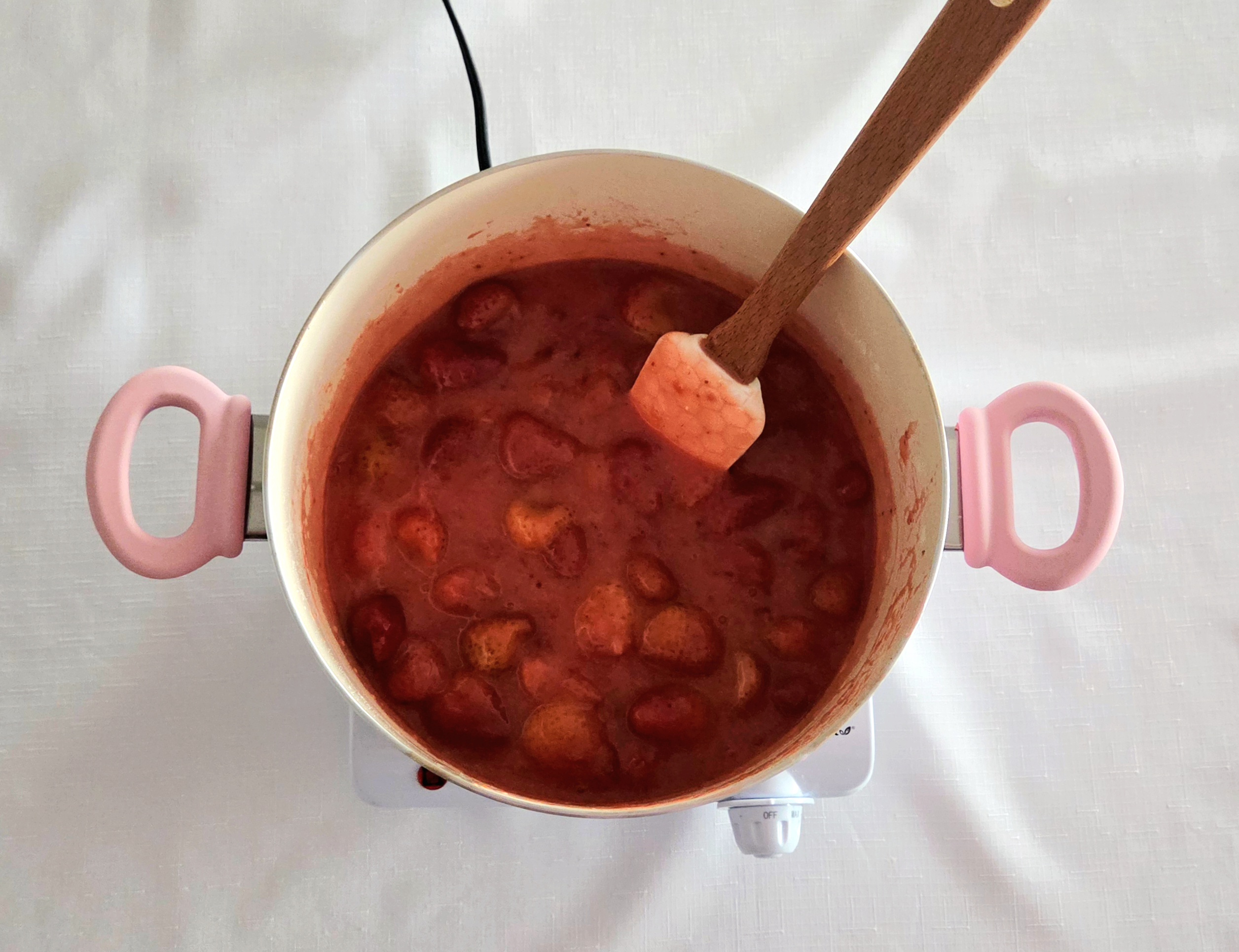 Uncover the pan and stir the berries. If they’ve started to get juicy, leave the lid off and stir occasionally. If they’re still mostly frozen, cover them once more and allow them to sit for a few minutes longer. Do this until the strawberries release their juices and the mixture has started to come to a boil.