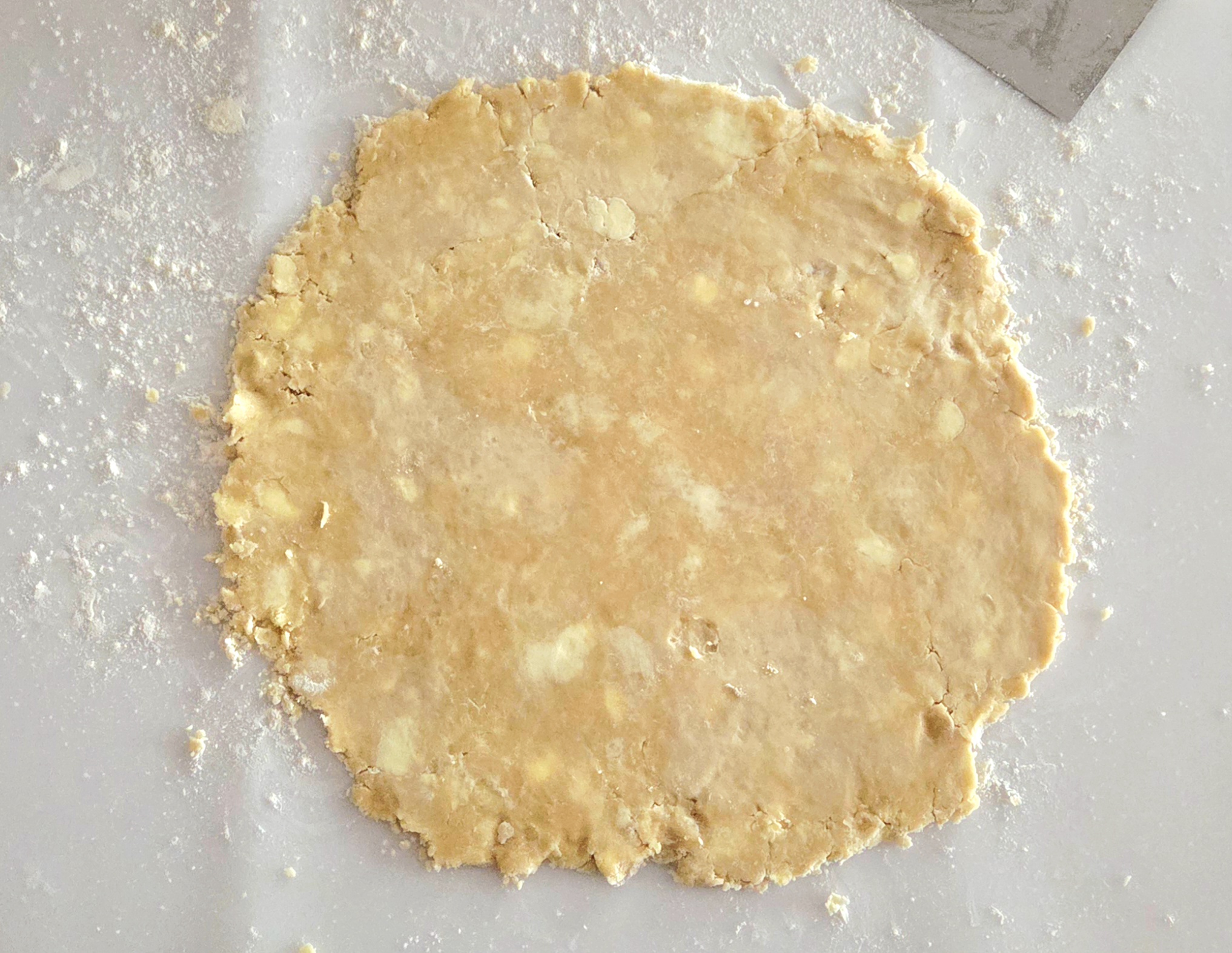 Take out one portion of dough, and unwrap it. Lightly flour a clean counter, place the disc in the center, and lightly flour the top of the disc. Using a rolling pin, roll out the dough into a circle with a 13 inch diameter. If at any point the dough starts to stick to either the counter or the rolling pin, gently peel it away and add a little more flour.