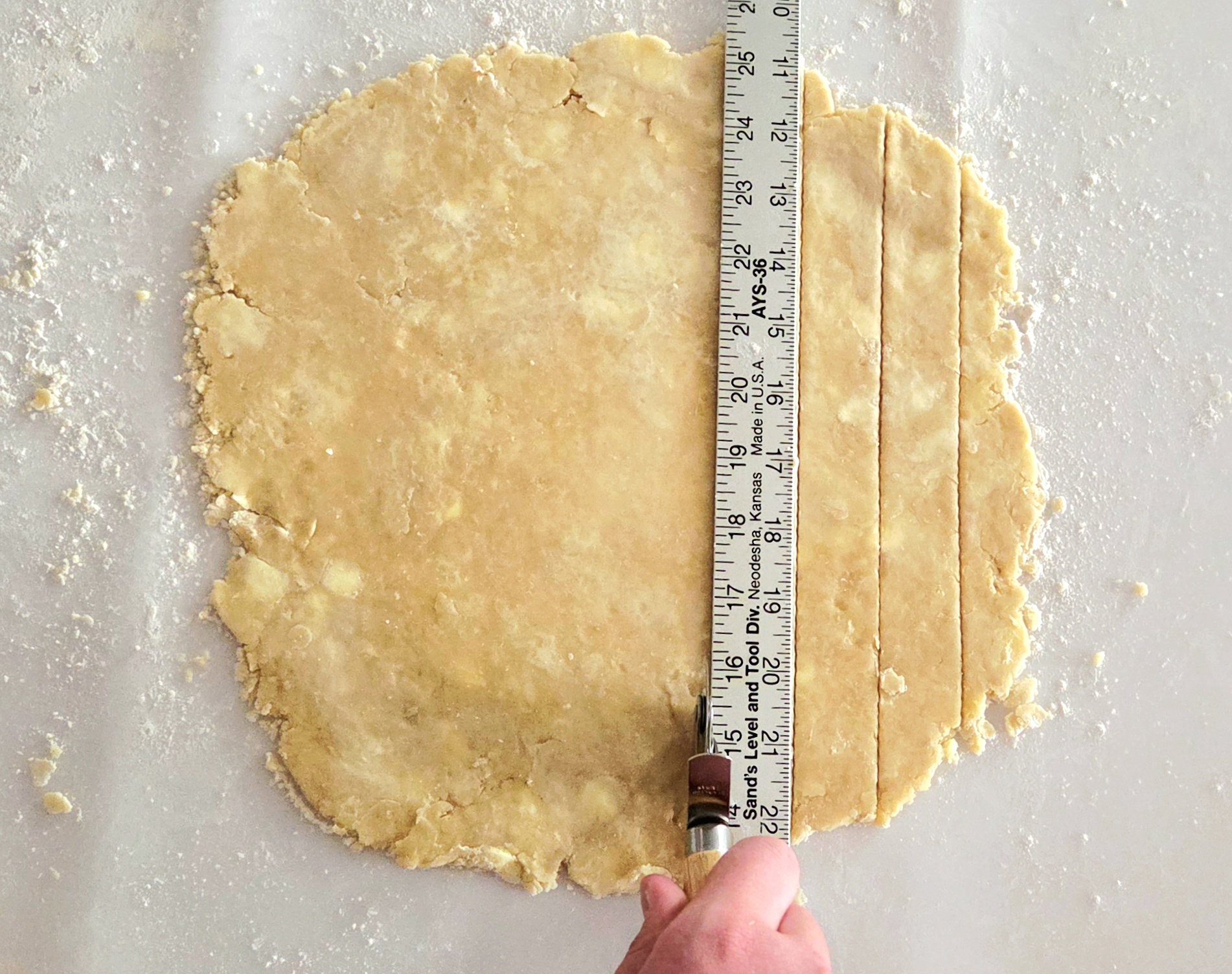 Using a knife, bench scraper, or pizza wheel, cut the dough into 1 inch strips. To make it easier to get straight, even lines, I just take a ruler as a guide. A standard ruler is approximately 1 inch wide, so I utilize the straight edge to cut along and then move the ruler across so it’s lined up perfectly with the previous cut before making another one.