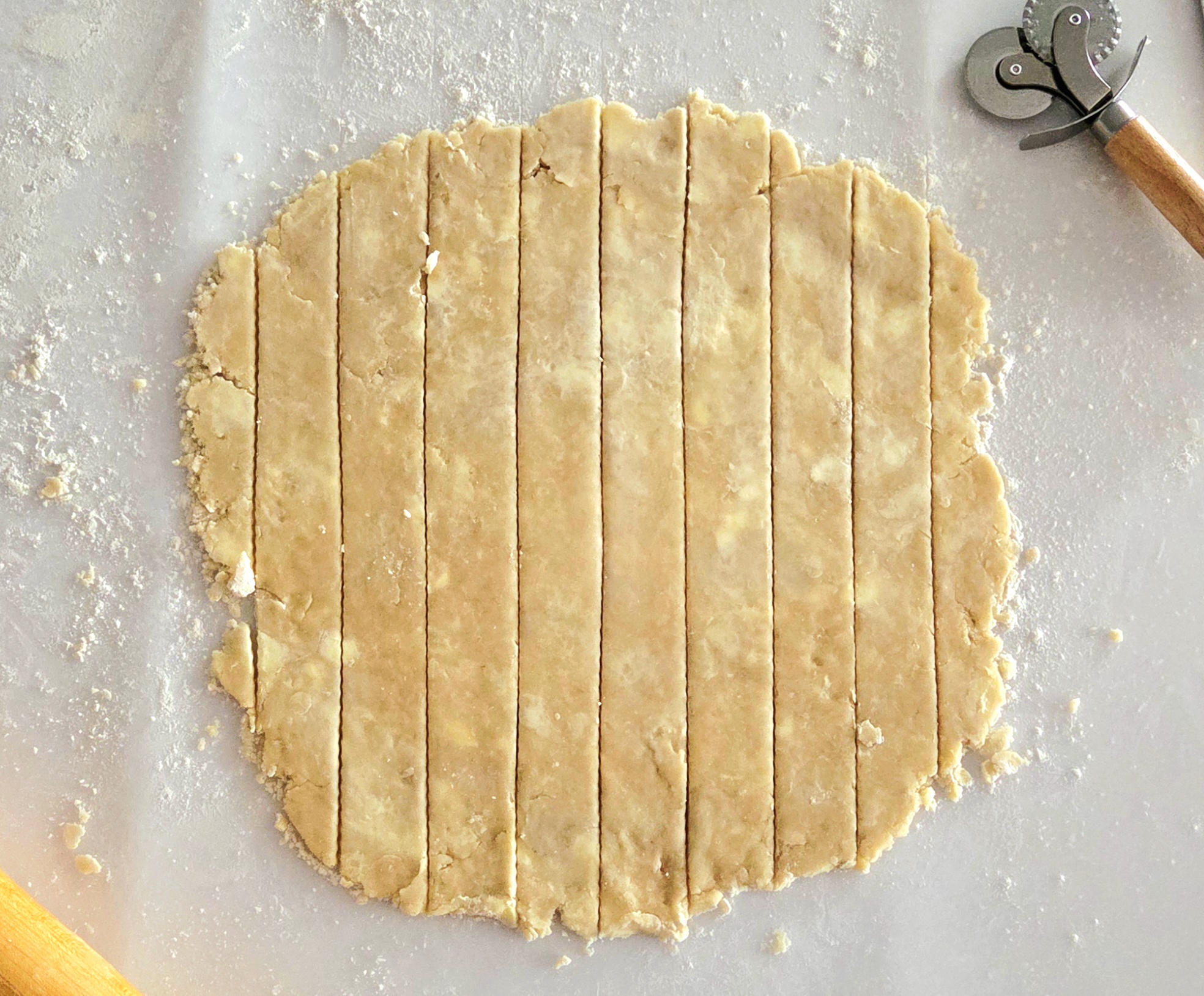- Lightly flour the counter once more, and place the larger unwrapped disc of dough in the center. Lightly flour the disc and roll it out into a 10-11 inch square. Slice the square into 1-inch strips, using a ruler as a guide if desired.