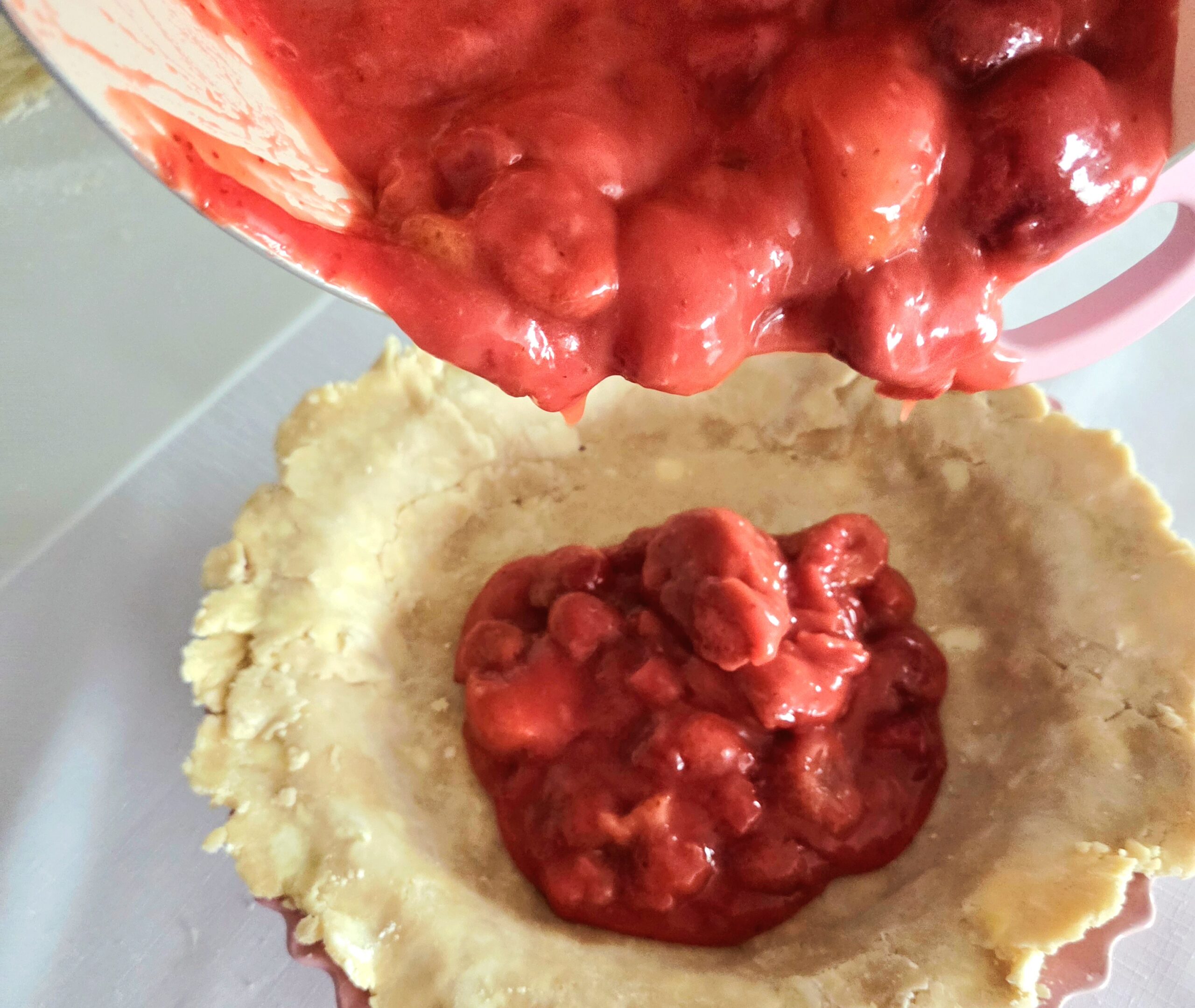 - Pour the completely cooled filling into the dough lined pie dish. Set it aside while you prepare the top crust.