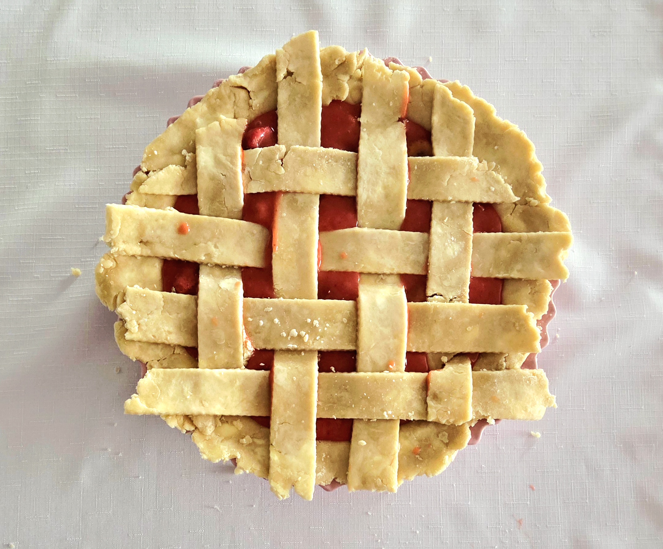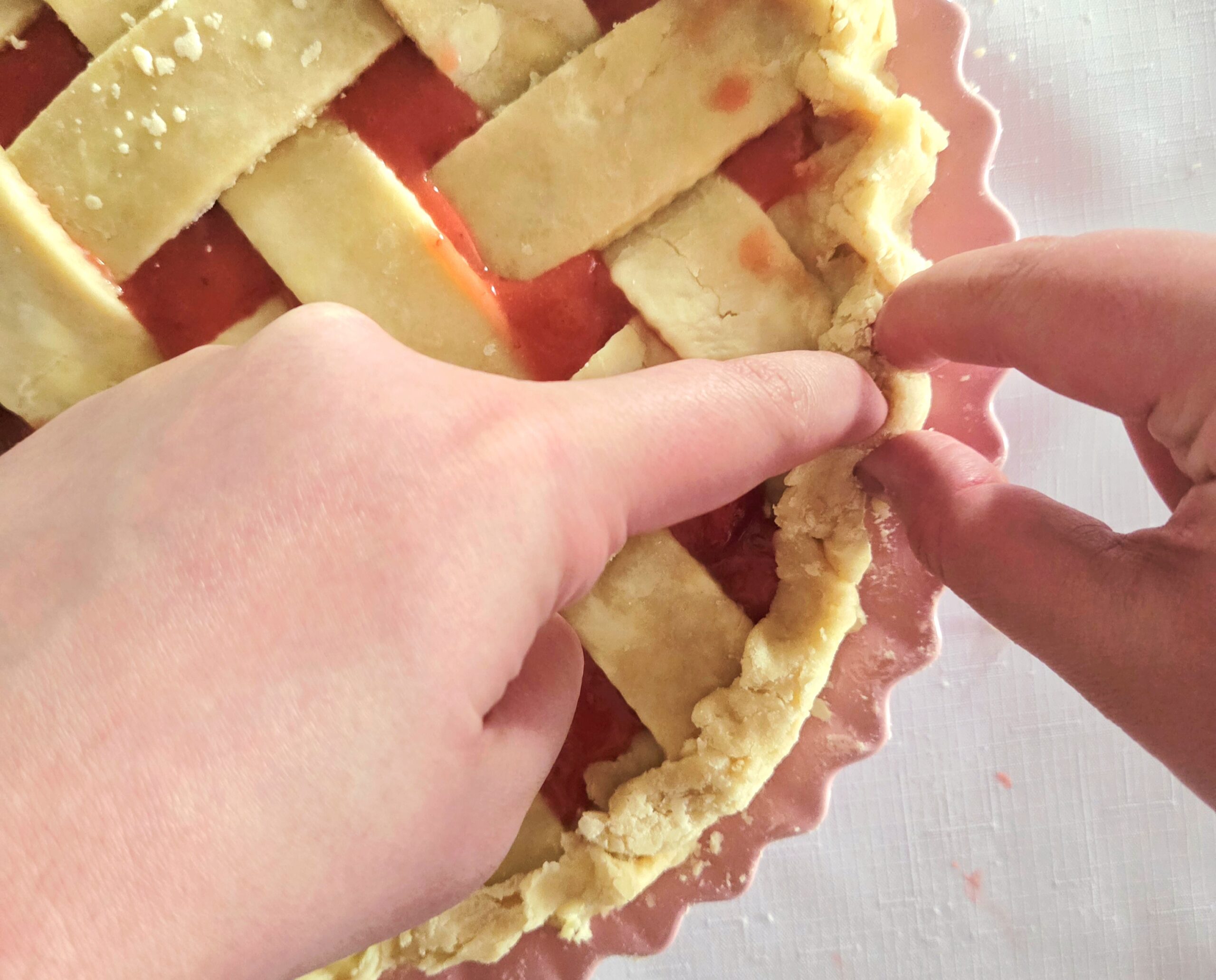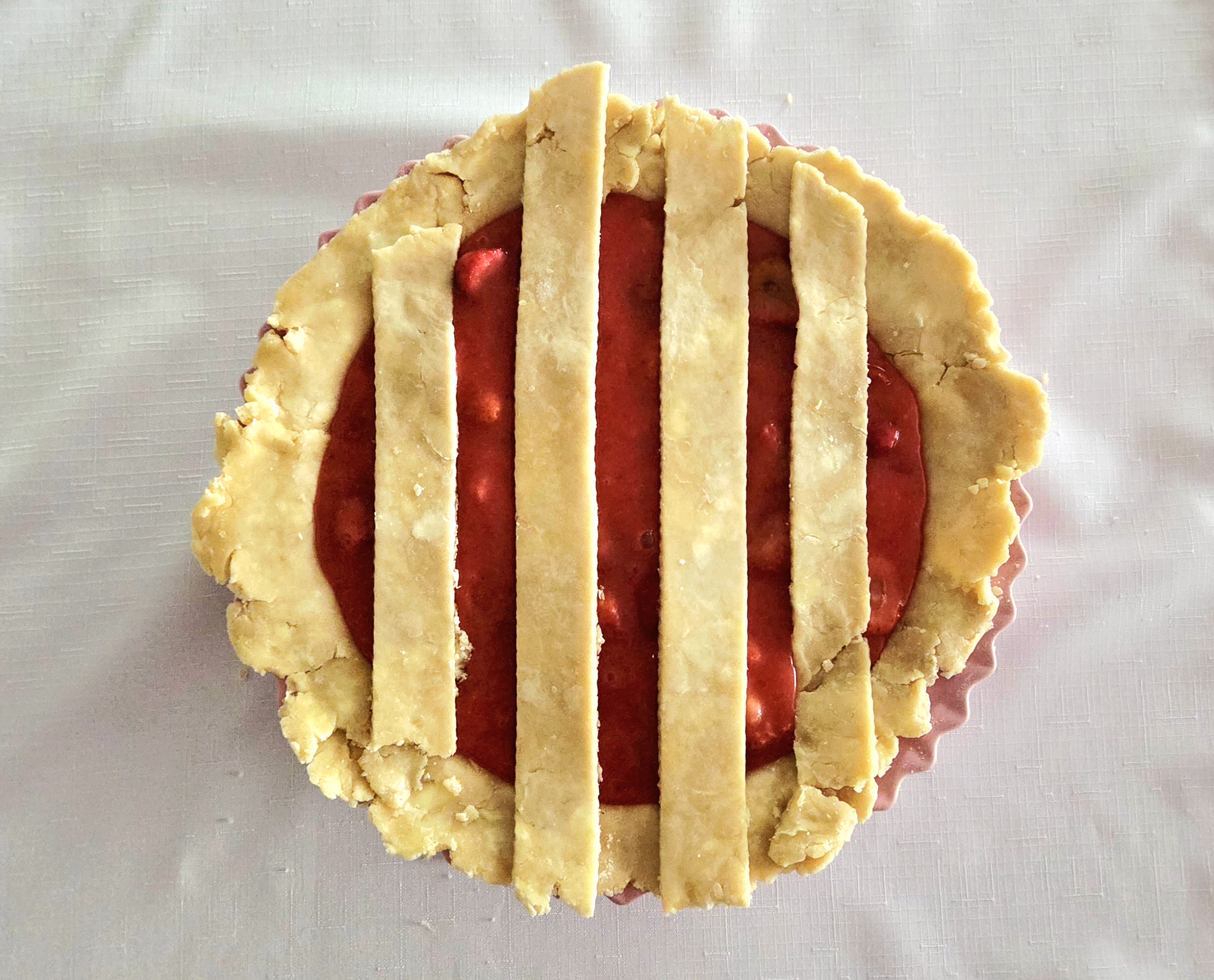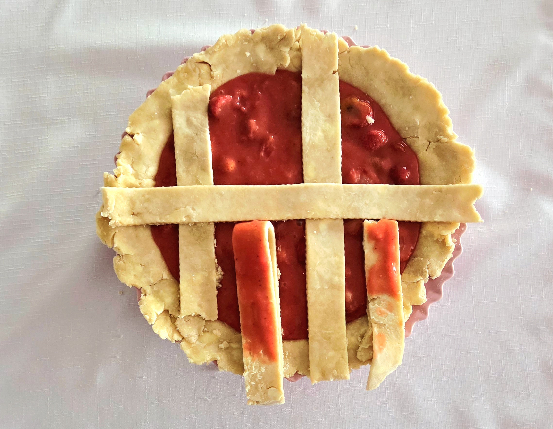 Repeat the process on the other end of the pie, so you have a 4×4 strip lattice top. If at any point the dough becomes difficult to work with, place everything in the fridge for a few minutes to firm up once more.