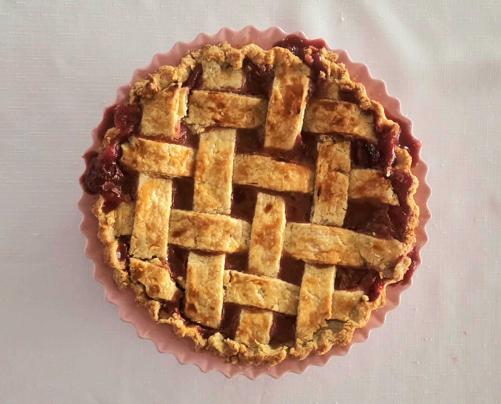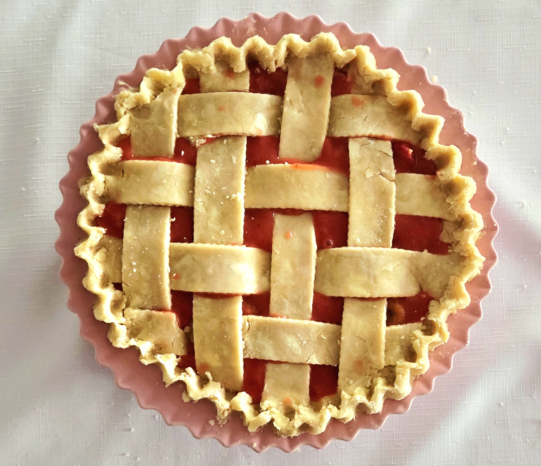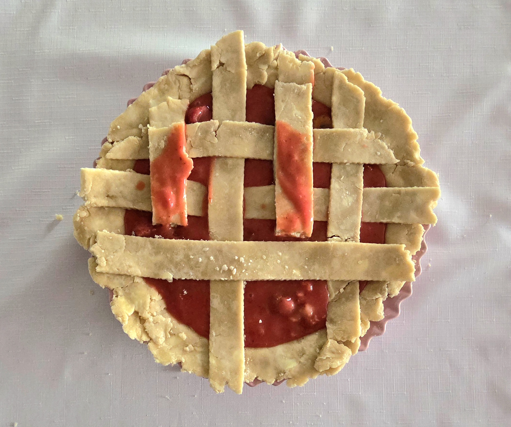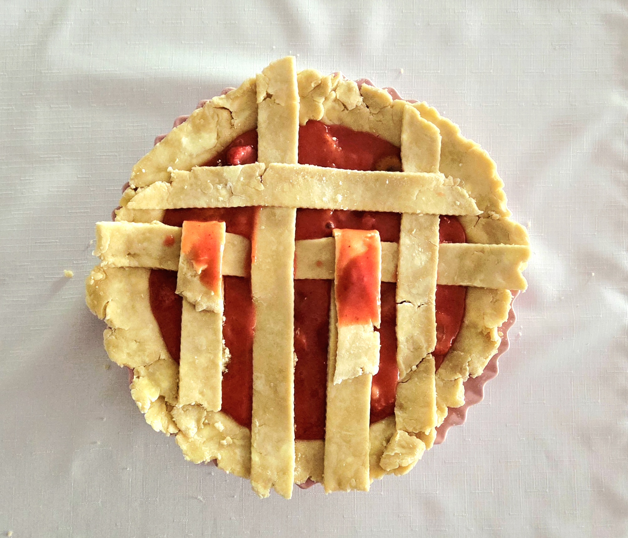 Repeat the process on the other end of the pie, so you have a 4×4 strip lattice top. If at any point the dough becomes difficult to work with, place everything in the fridge for a few minutes to firm up once more.